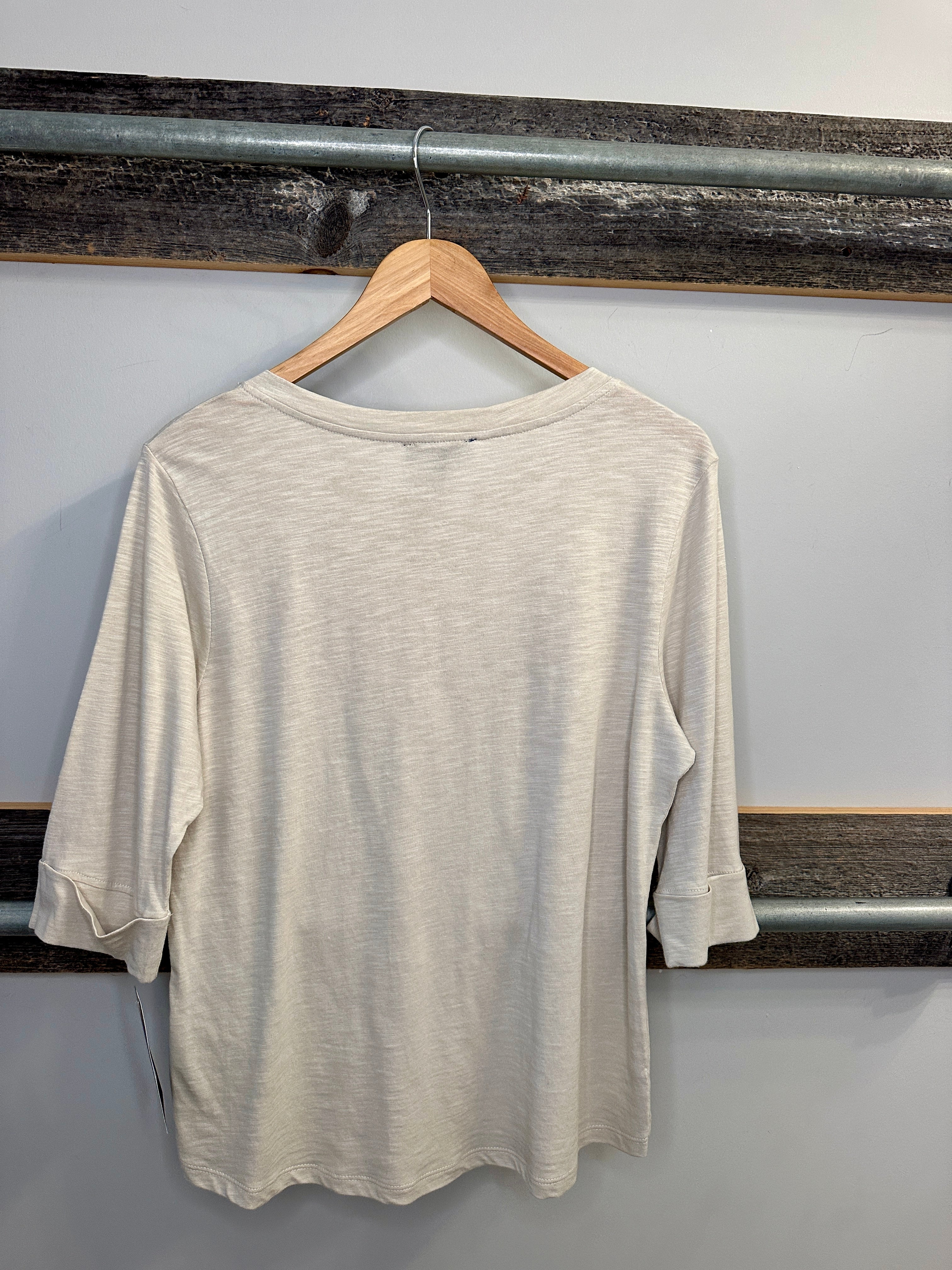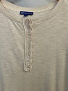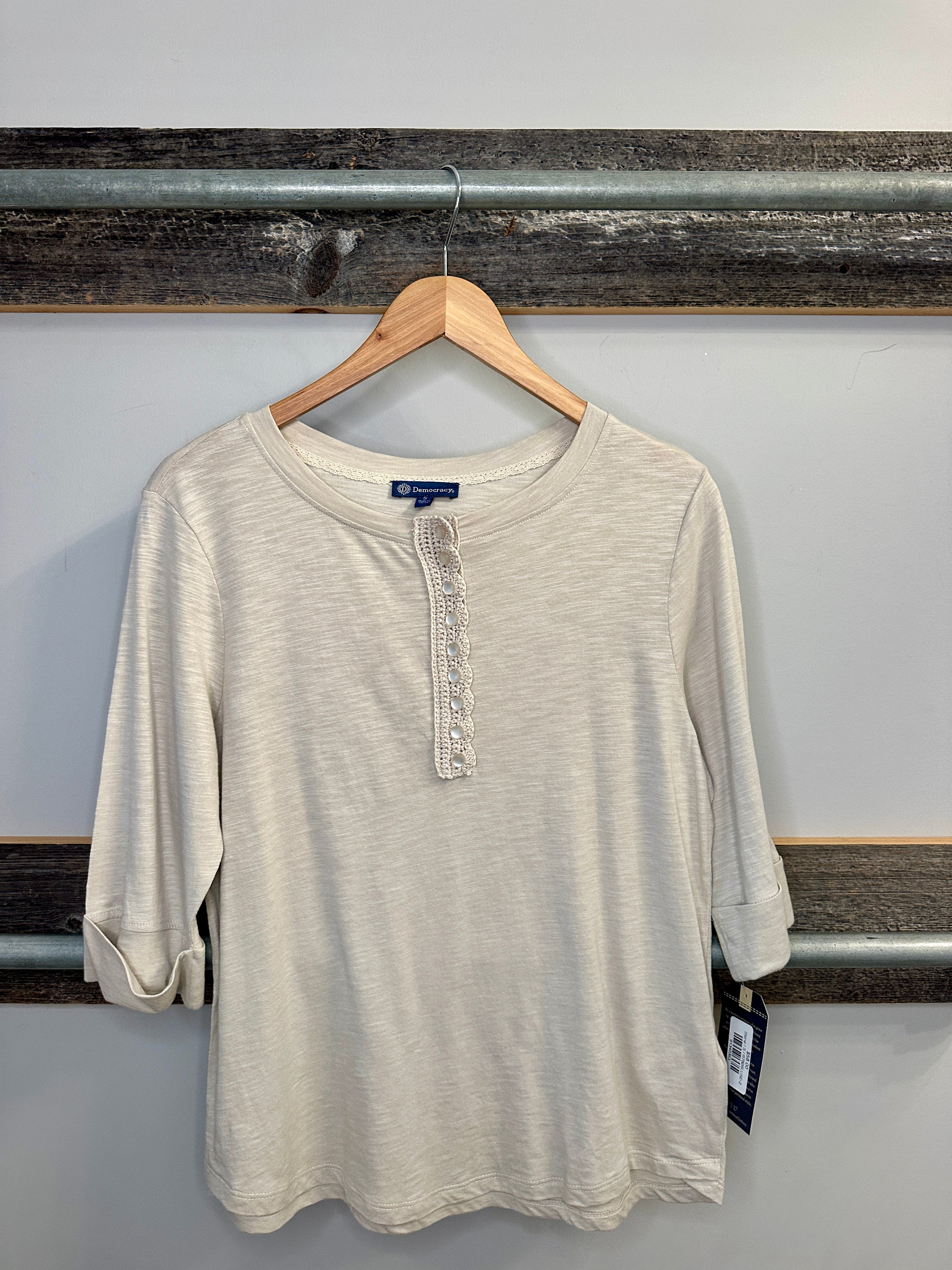 Elbow Roll Cuff Sleeve Henley Knit Top with Crochet Detail
