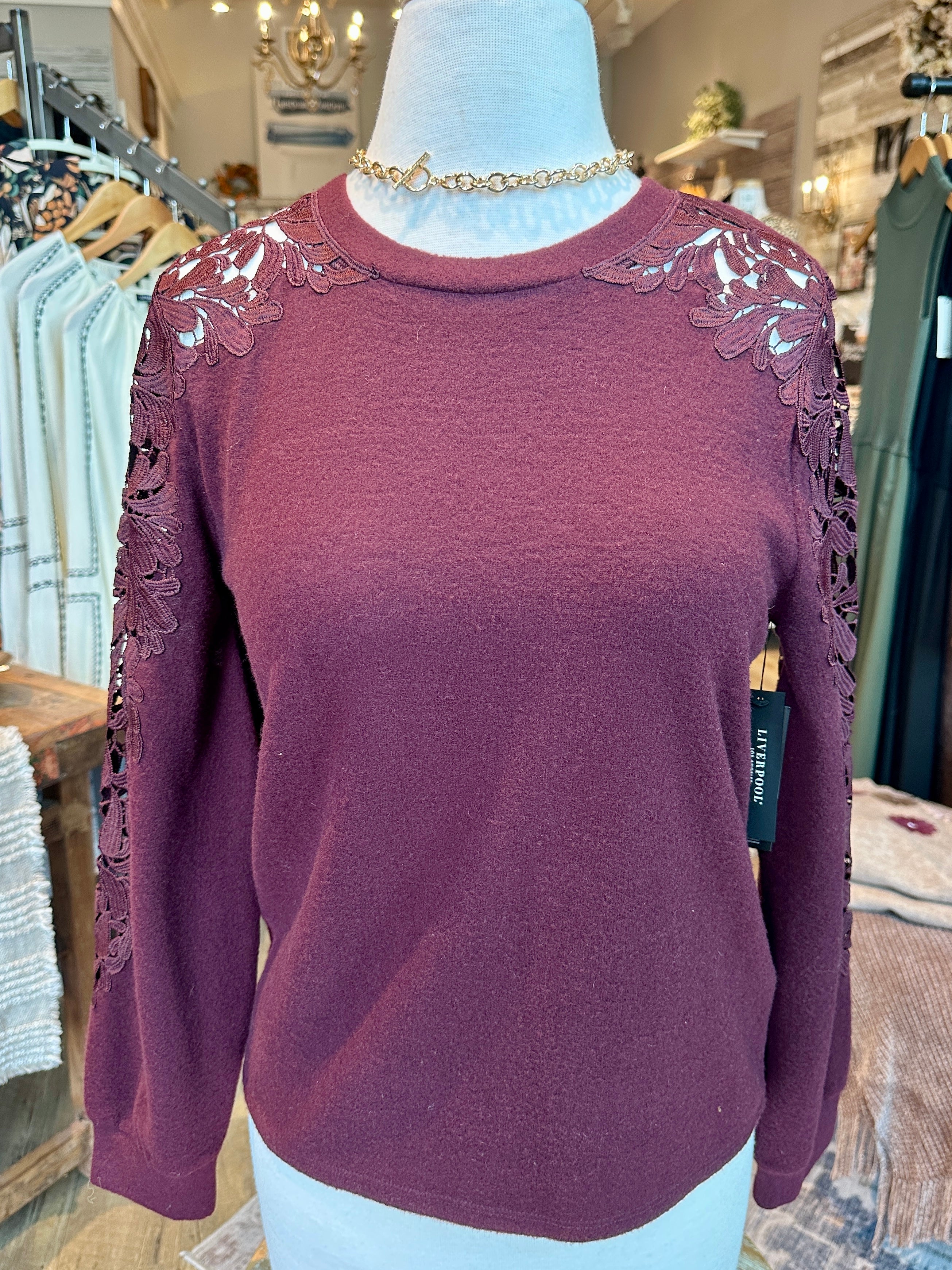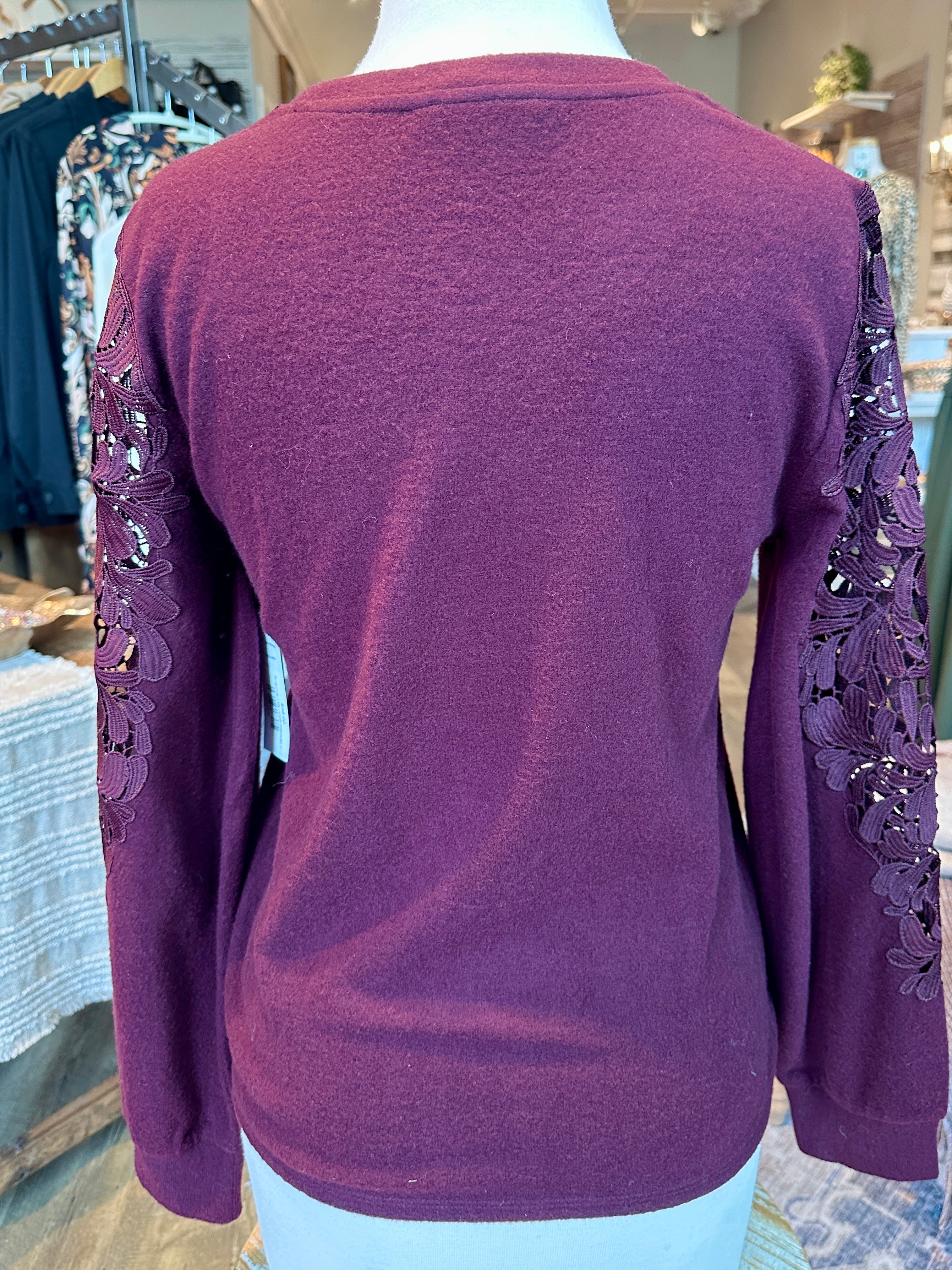 Elevate your every-day with this stunning top. Feminine and chic, this soft knit sweater features intricate lace appliqué along the shoulders and sleeves, adding a romantic touch that feels both modern and timeless. Lightweight yet cozy, this top brings the perfect blend of comfort and elegance—ideal for dinners out, holiday gatherings, and everything in between.