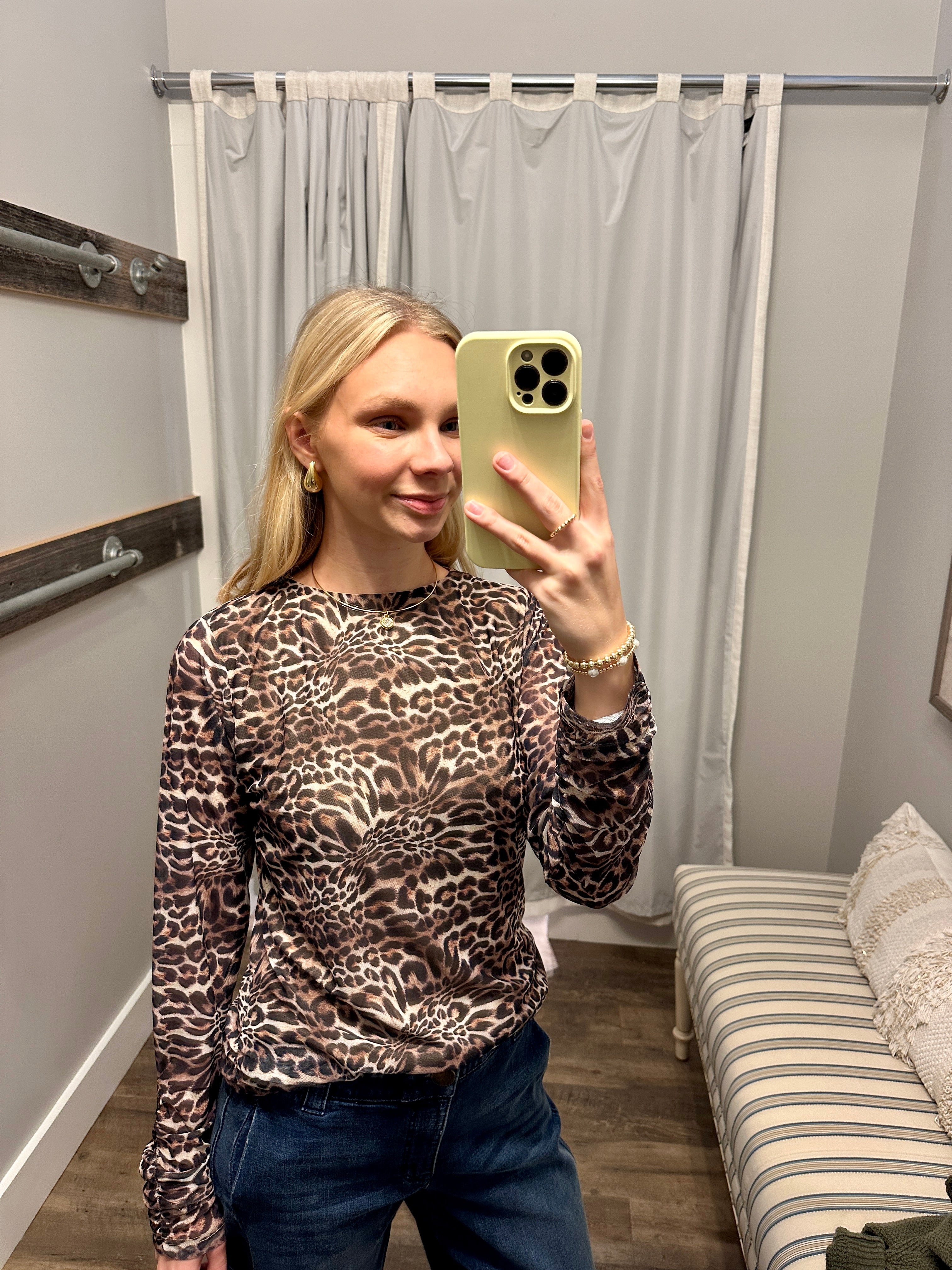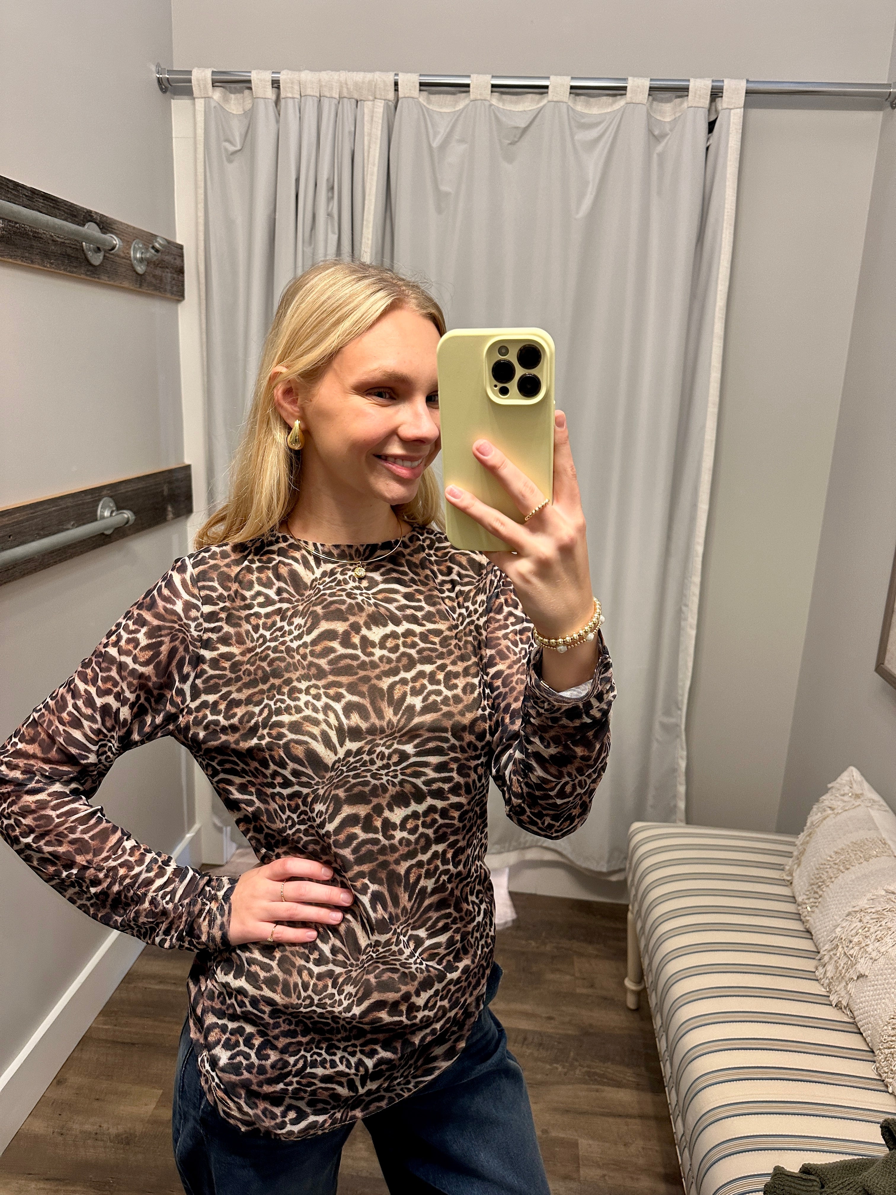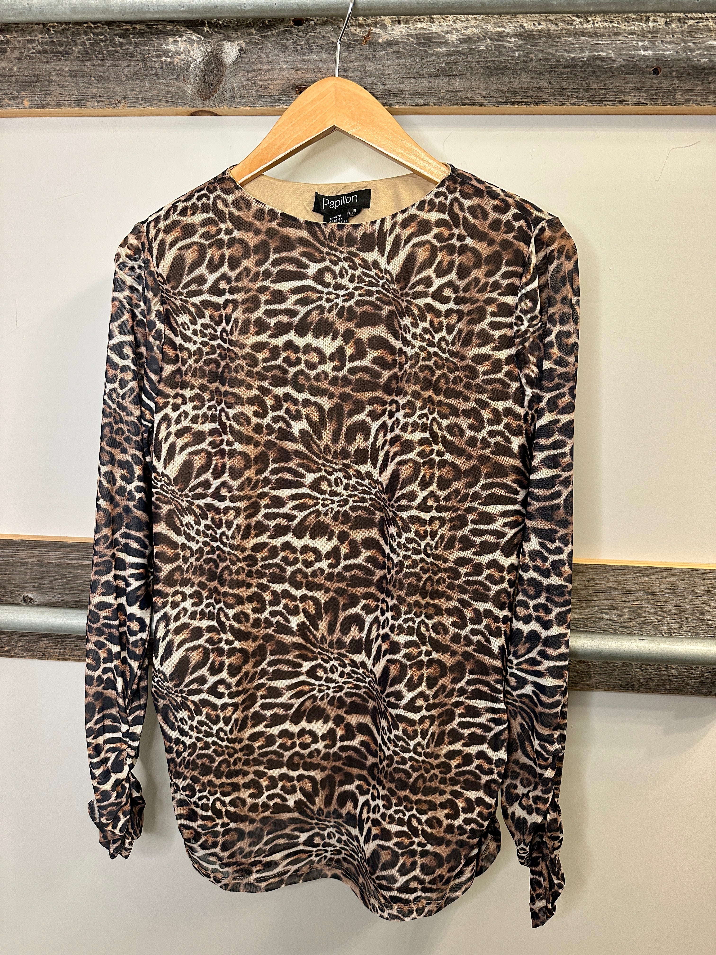 This top is a long-sleeve, animal print blouse from Papillon, featuring a bold leopard-inspired pattern with swirling, symmetrical designs that add visual movement. The fabric is lightweight and slightly sheer, offering a soft drape that contours comfortably to the body. It has a classic crew neckline and subtly ruched sleeves near the wrists for a touch of texture and shape.