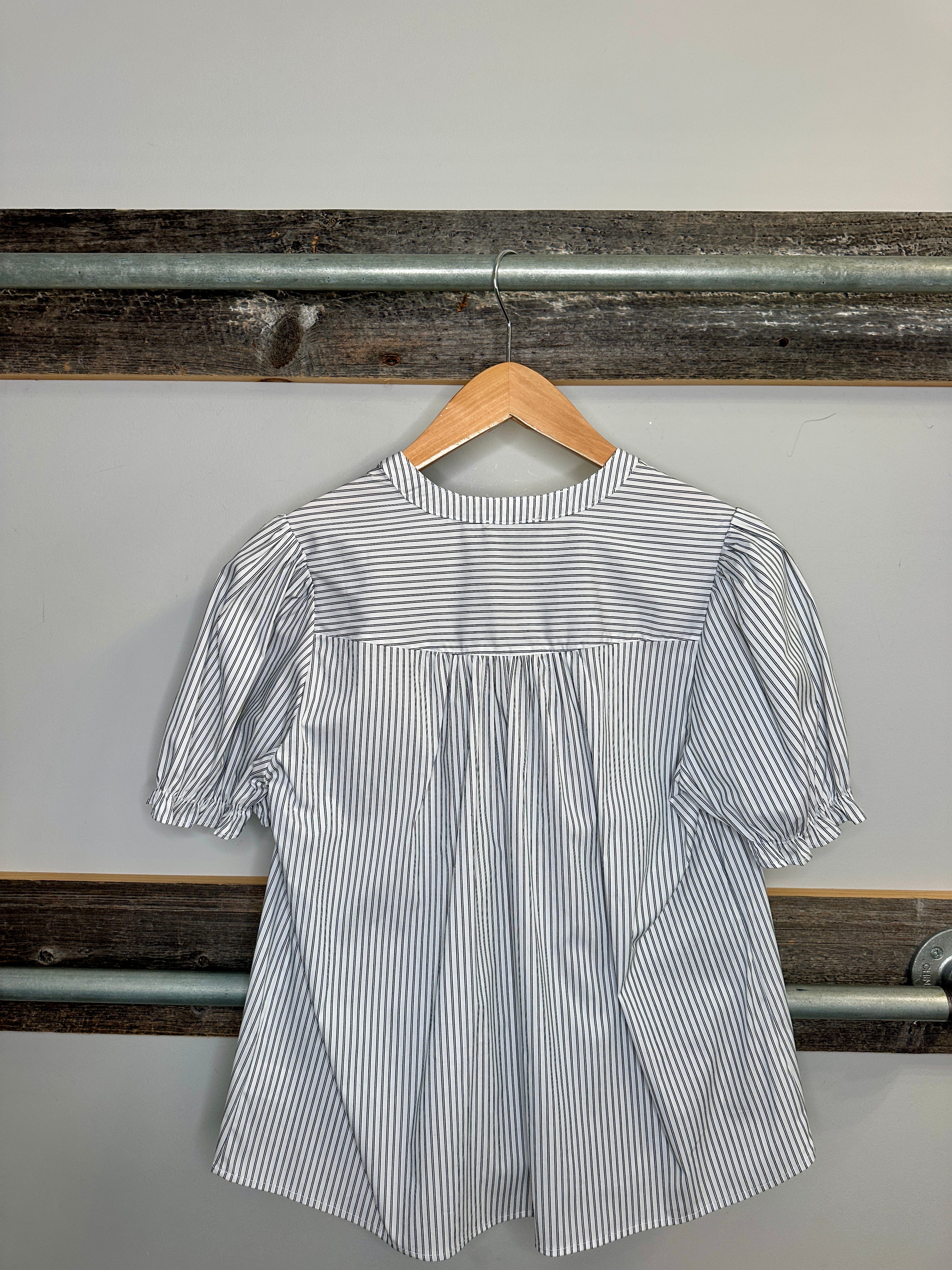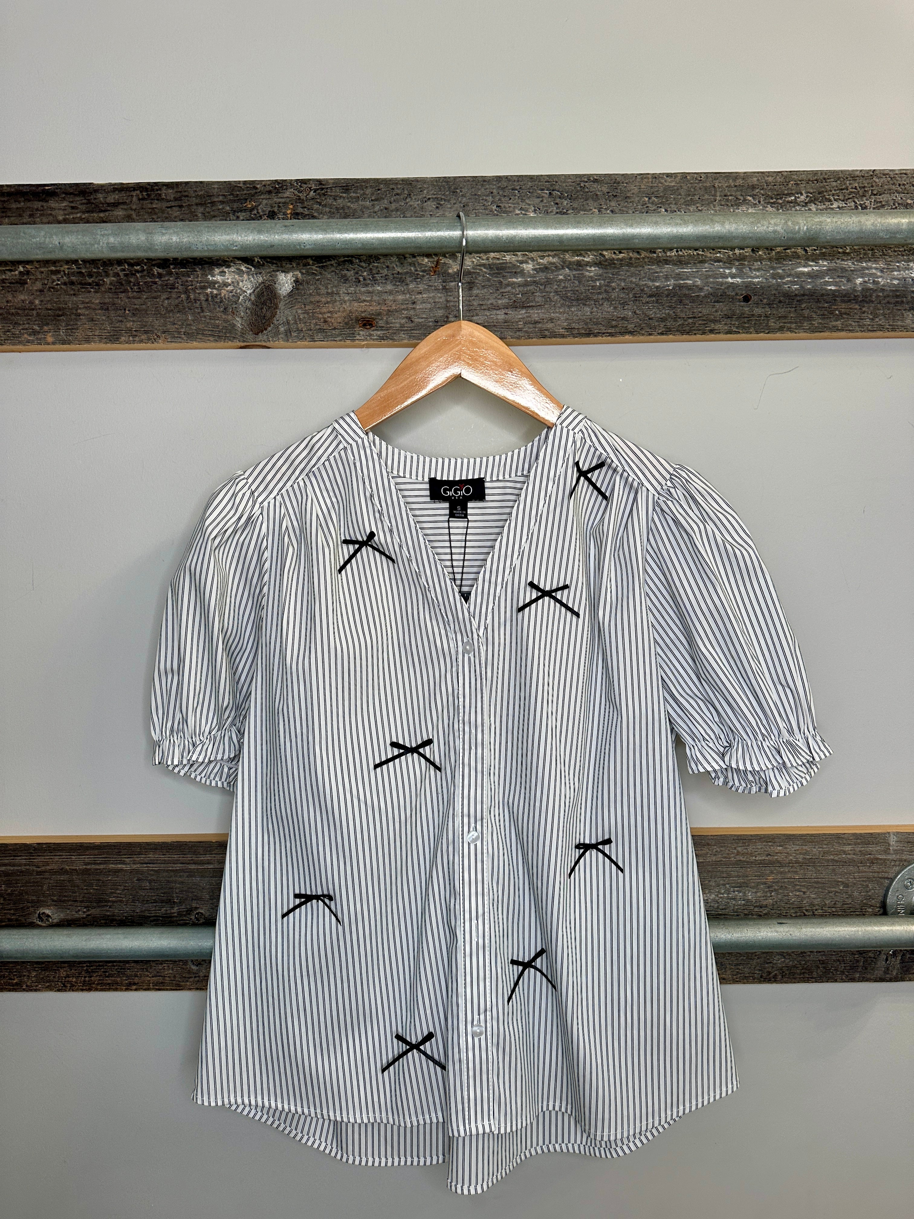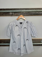 This chic black and white blouse is versatile and stylish, perfect for work, a fun outing, or a date night. With its playful balloon sleeves and delicate front bows, it adds a unique touch that is sure to earn you compliments.