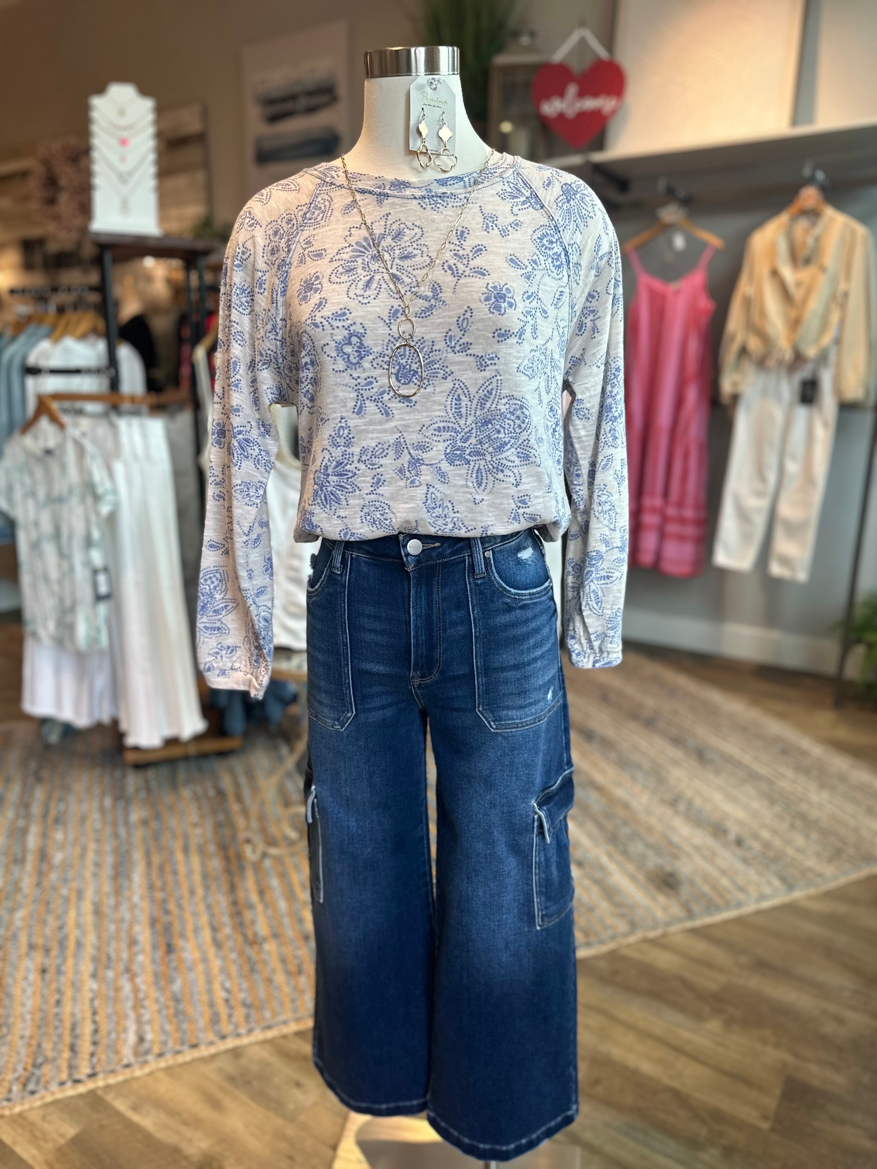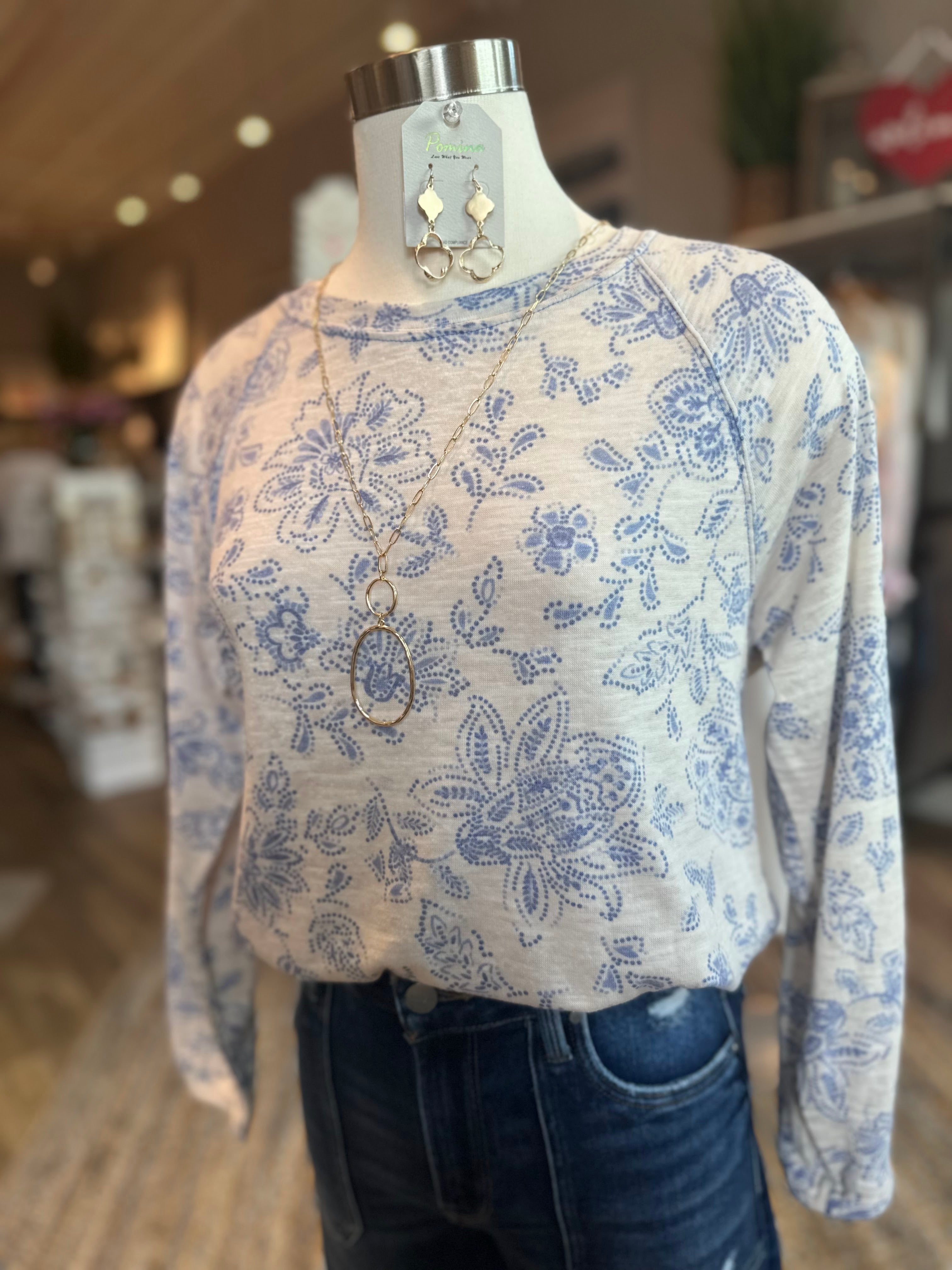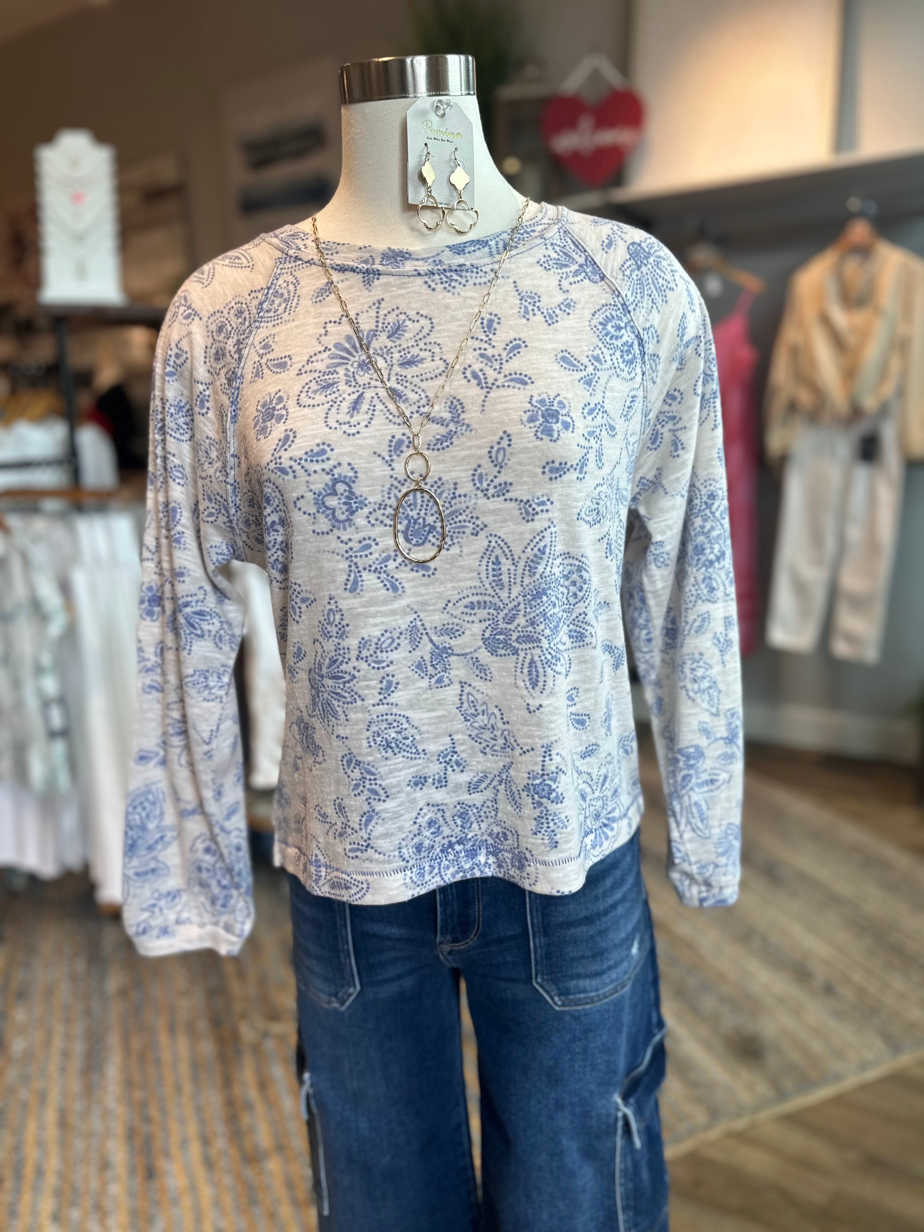 Long Raglan Sleeve Scoop Neck Floral Print Knit Top