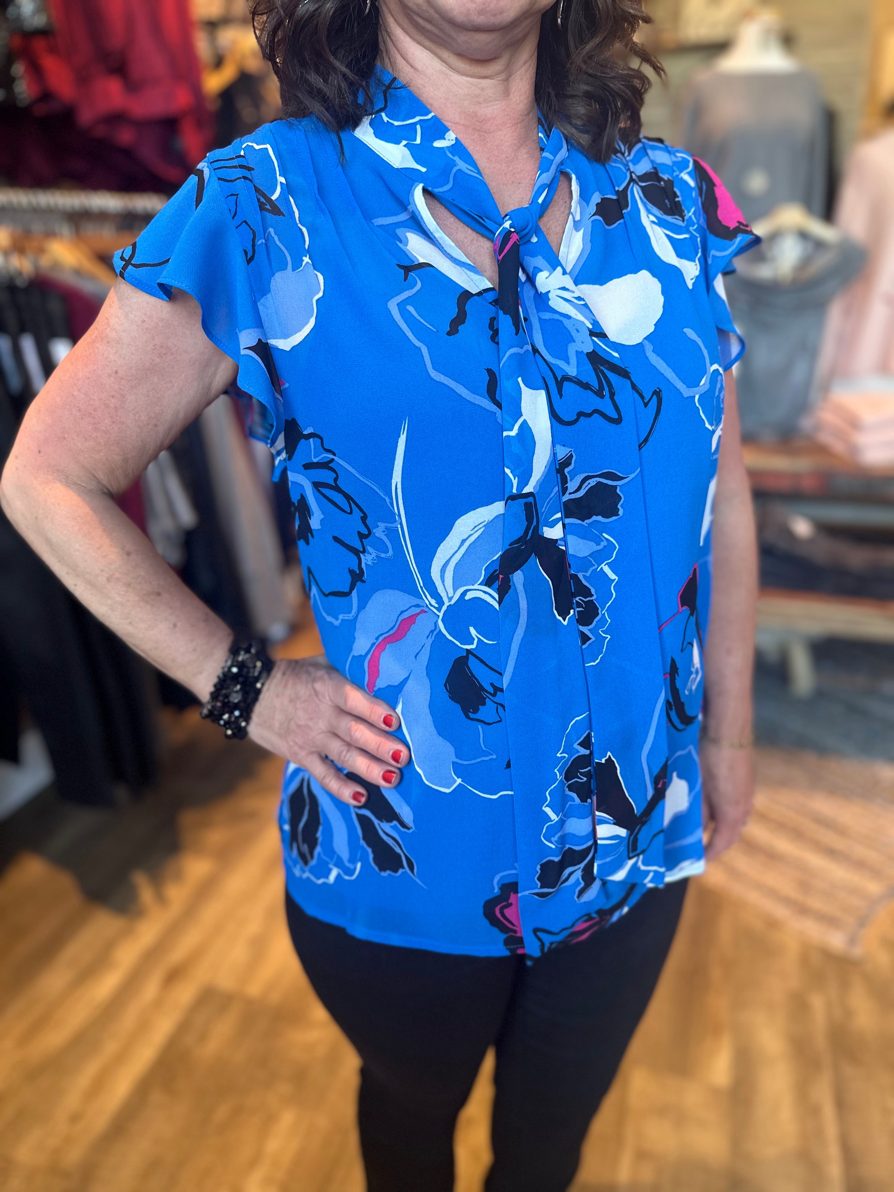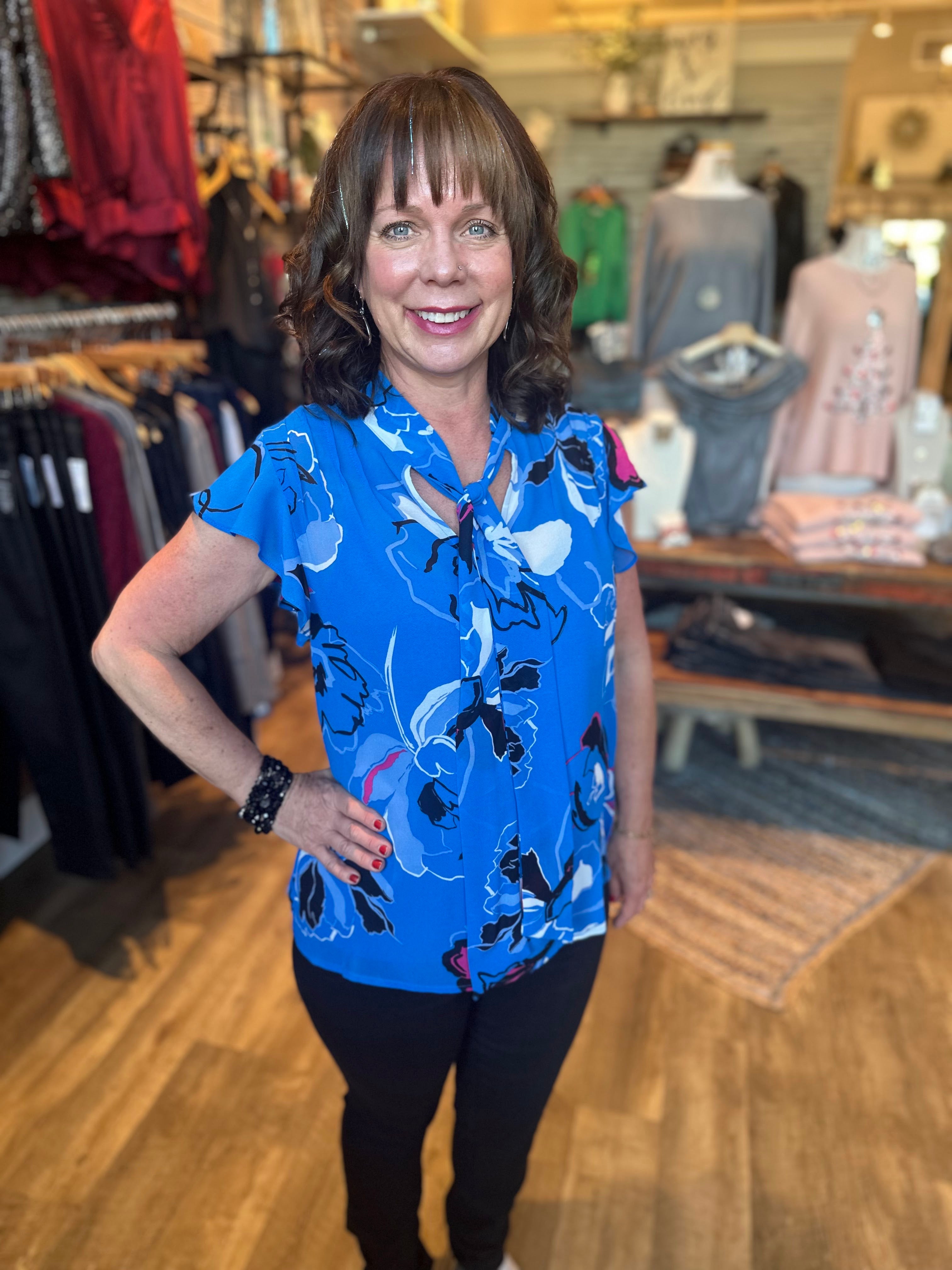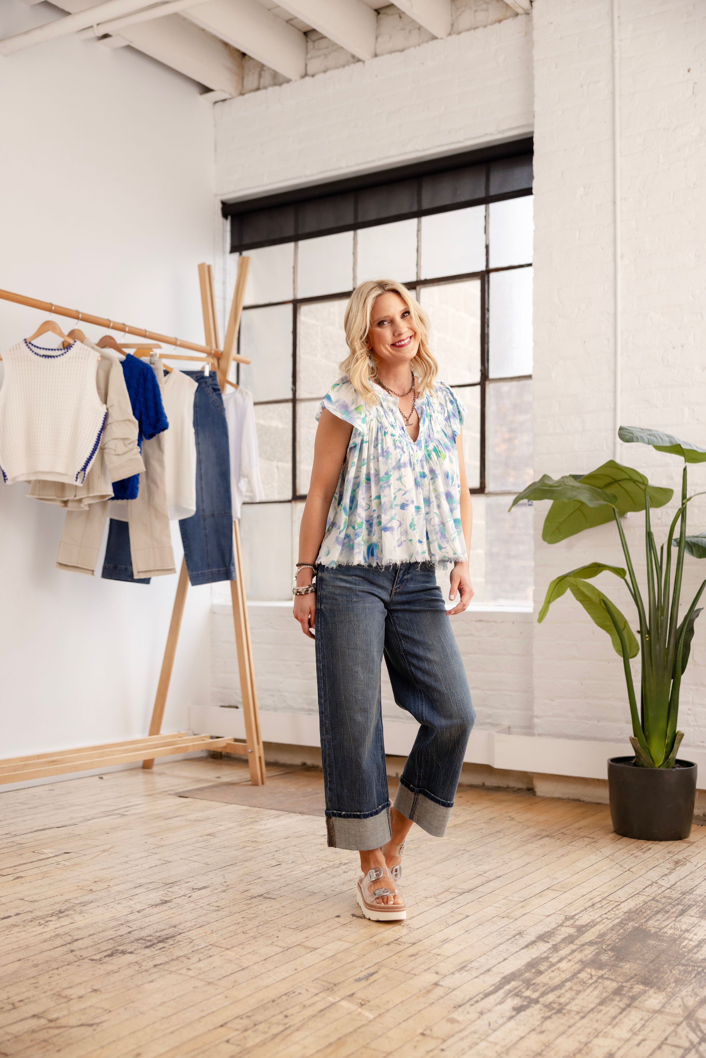 Short Bell Sleeve Ruffle Edge V-Neck Floral Print Woven Top