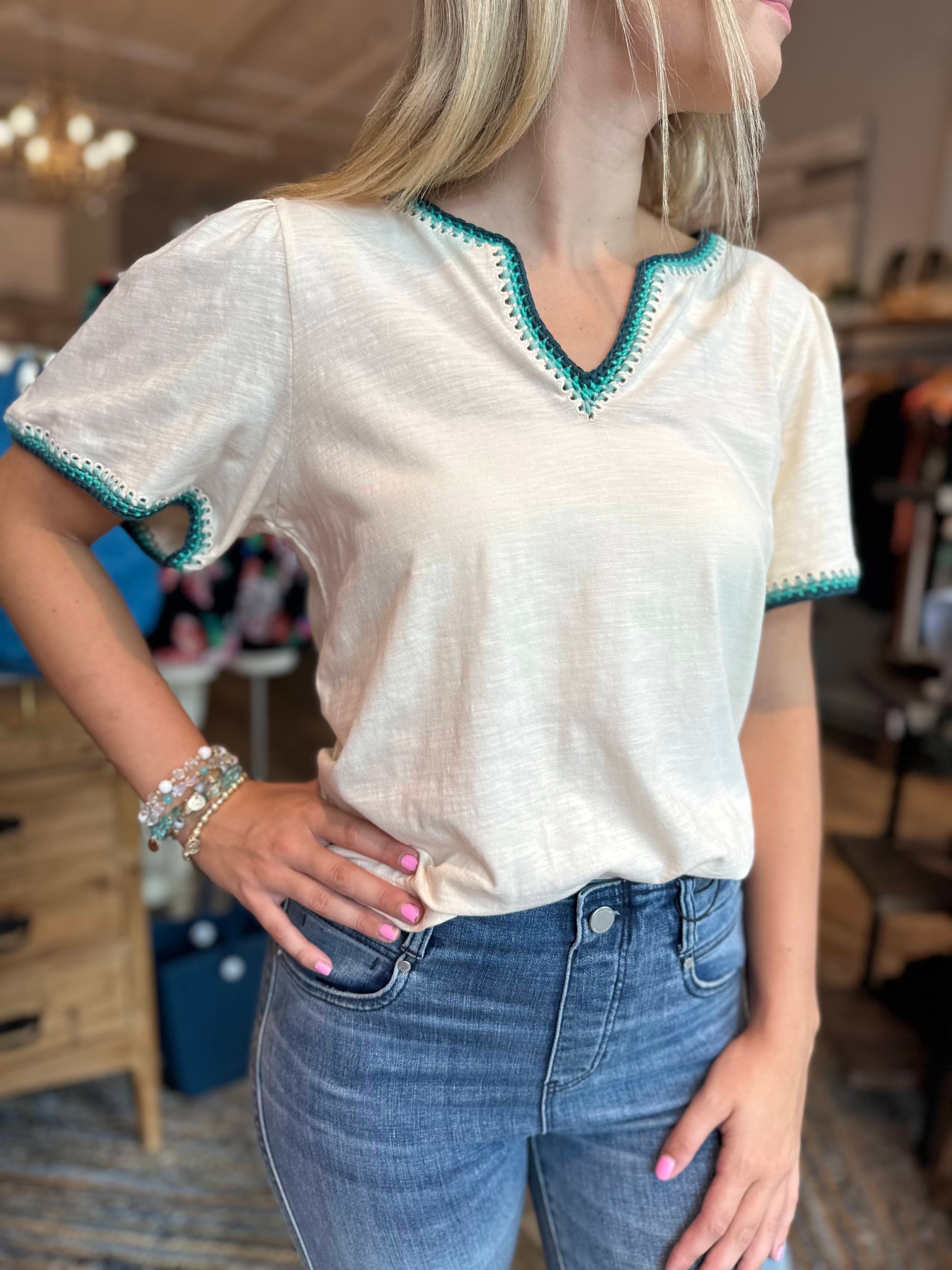 Short Bell Sleeve Crochet V Split Neck Knit Top