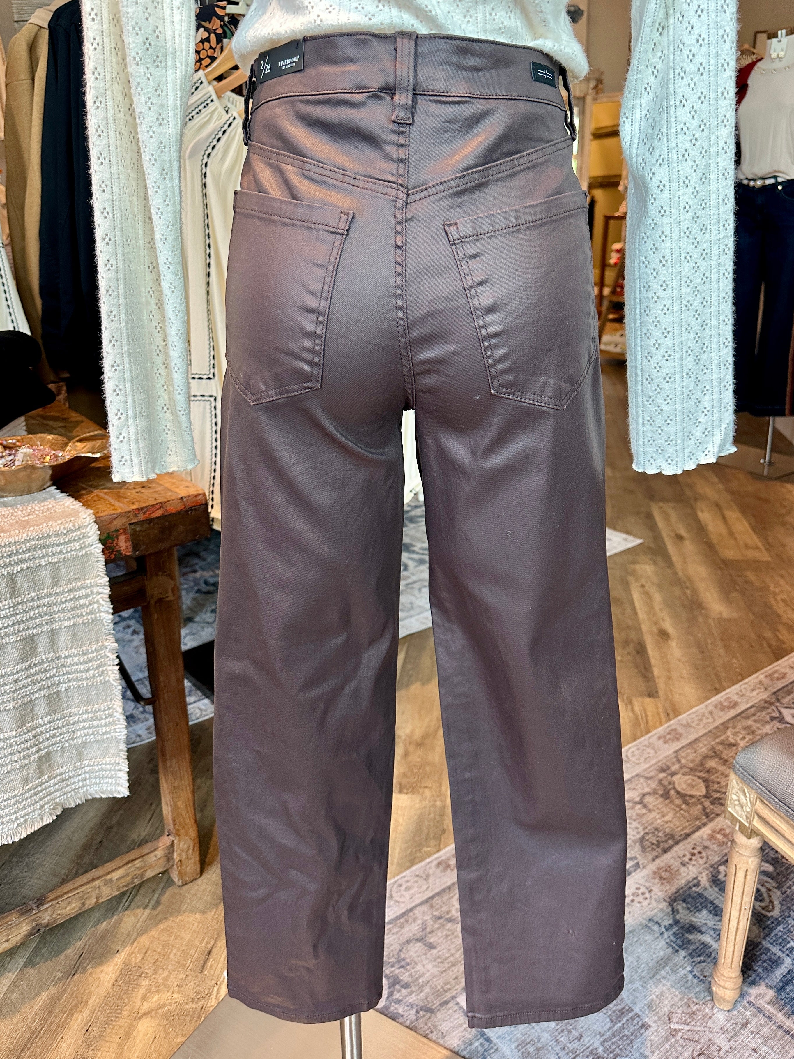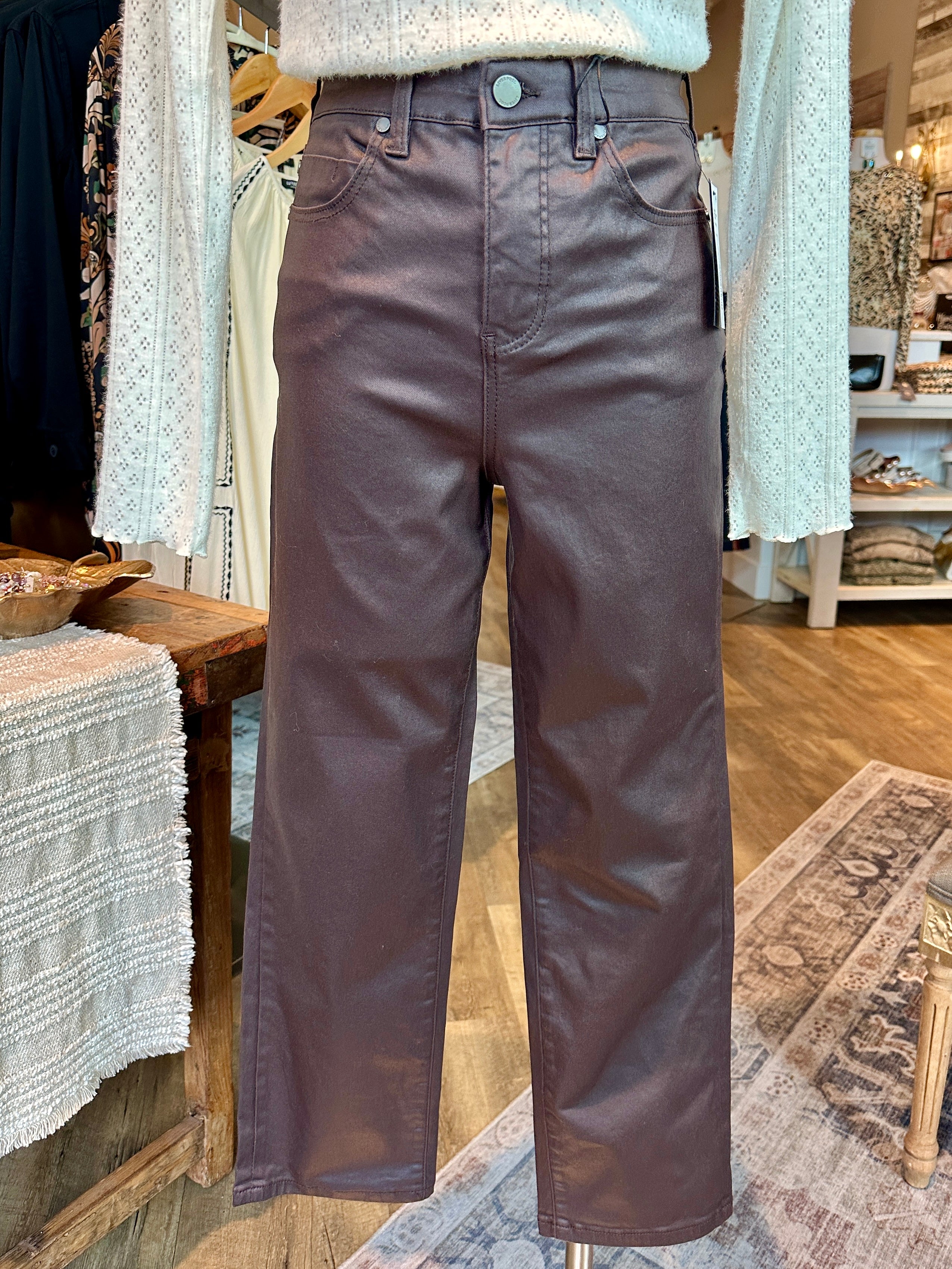 Give your denim a chic upgrade with these coated high-rise crop straight pants. Designed with a sleek leather-like finish, they offer a sophisticated, modern look while still feeling soft and comfortable. The structured high waist defines your shape and elongates your legs, while the wide leg creates an effortless, balanced silhouette. Dress them up with a blouse and heels for a night out or pair with a cozy knit and boots for everyday elevated style.