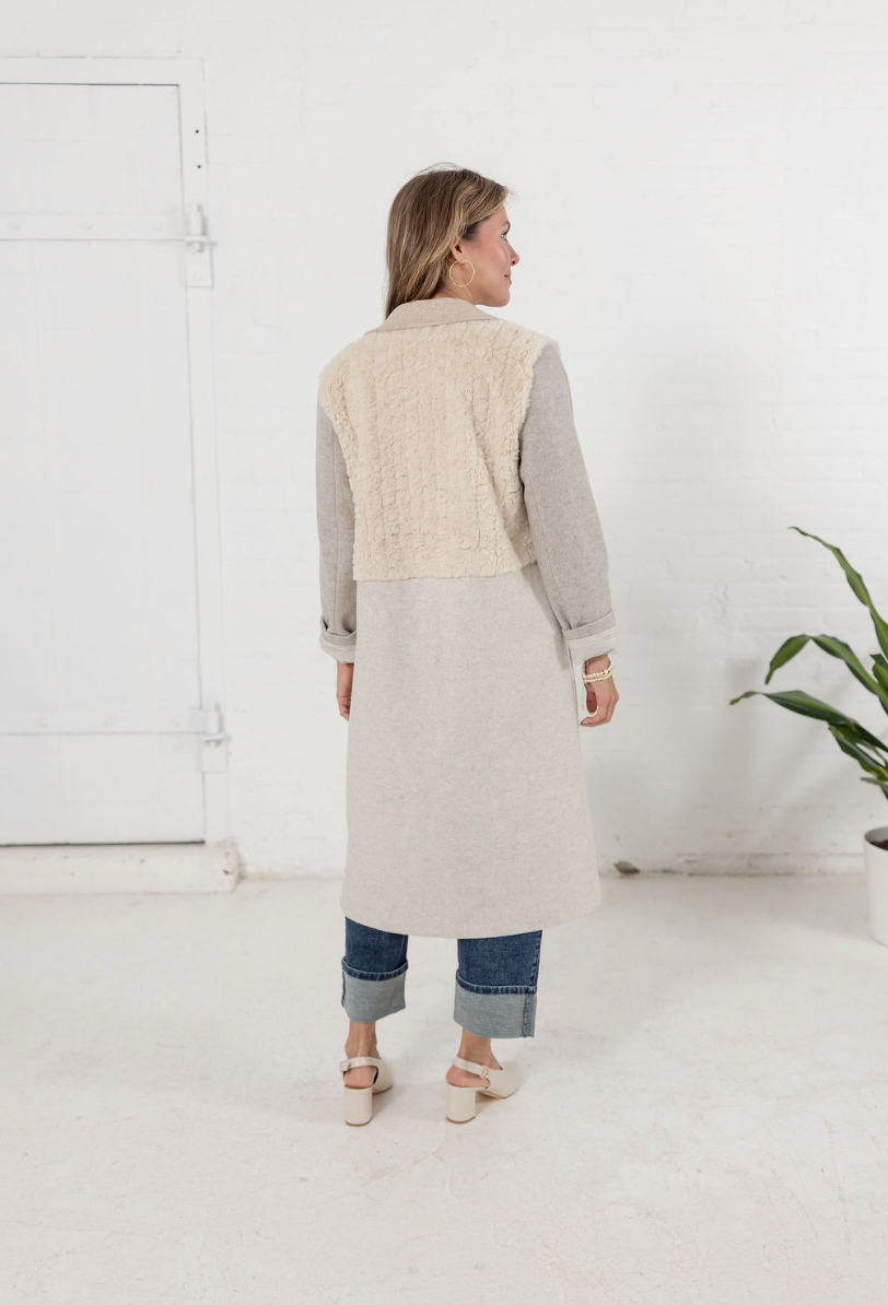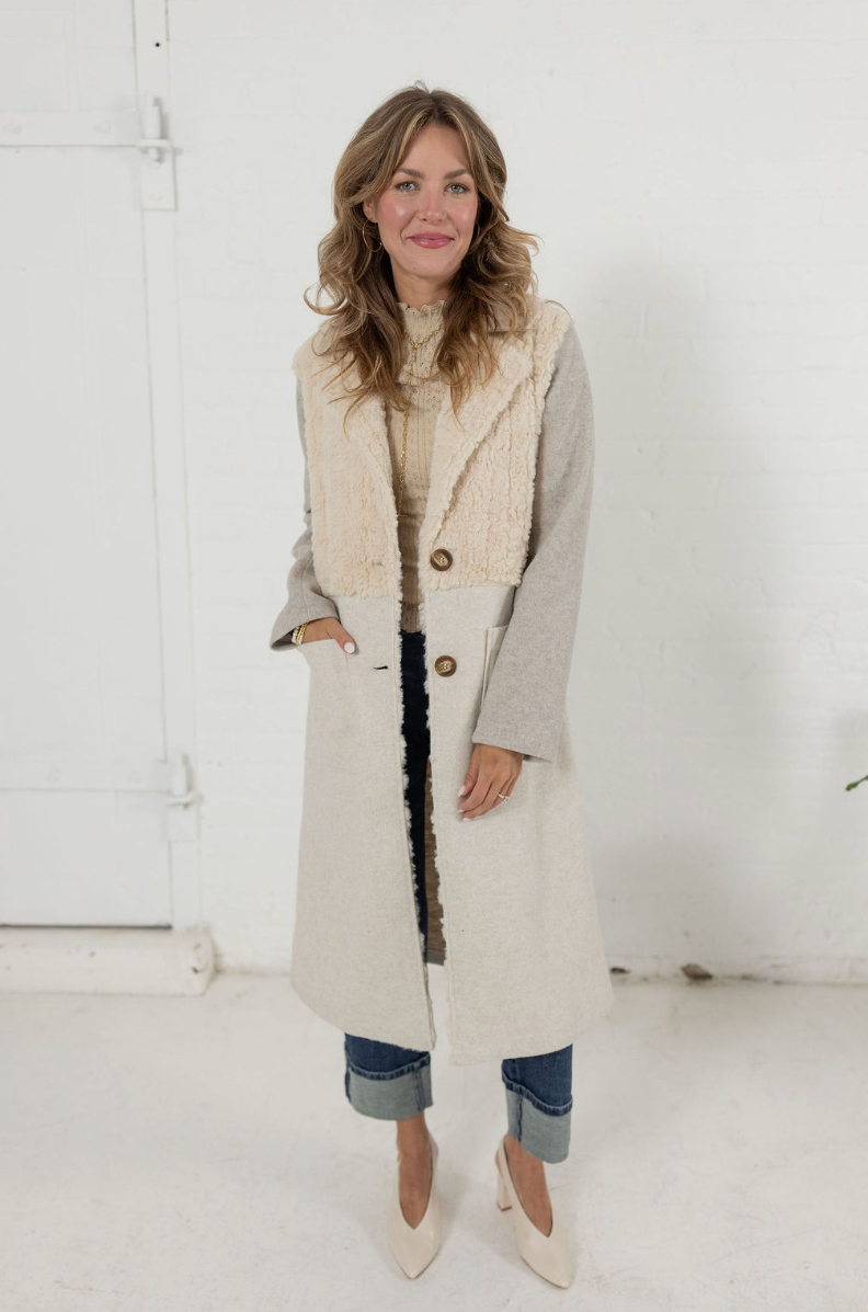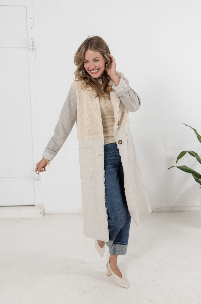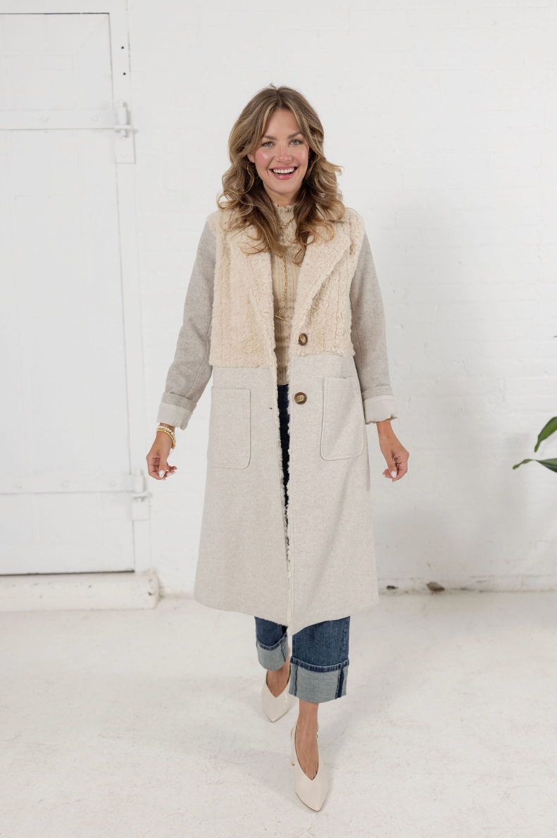 Wrap yourself in effortless sophistication. This mid-length piece combines plush sherpa texture on top with soft knit fabric along the sleeves and body. The neutral cream and oatmeal tones make it an instant classic — easy to pair with denim, turtlenecks, or dresses alike. Featuring oversized buttons, patch pockets, and a relaxed fit, it’s the ultimate layering staple for transitioning through chilly seasons in comfort and style.