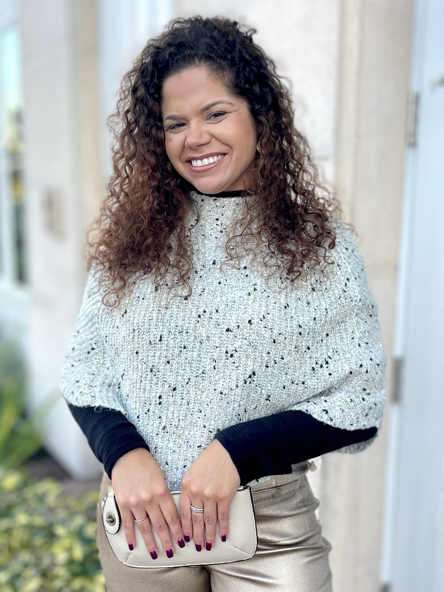 Wrap yourself in cozy, elevated style with our Mock Neck Speckled Yarn Sweater Capelet. This chic knit layer blends the effortless drape of a cape with the luxe feel of a sweater, making it the perfect statement piece for fall and winter. Crafted in a soft speckled yarn knit, it delivers comforting texture, subtle color dimension, and a polished mock neck for a modern, refined finish.