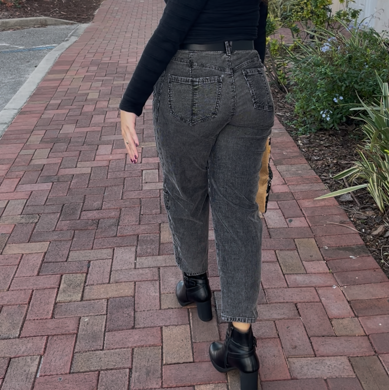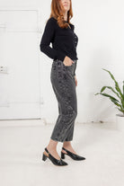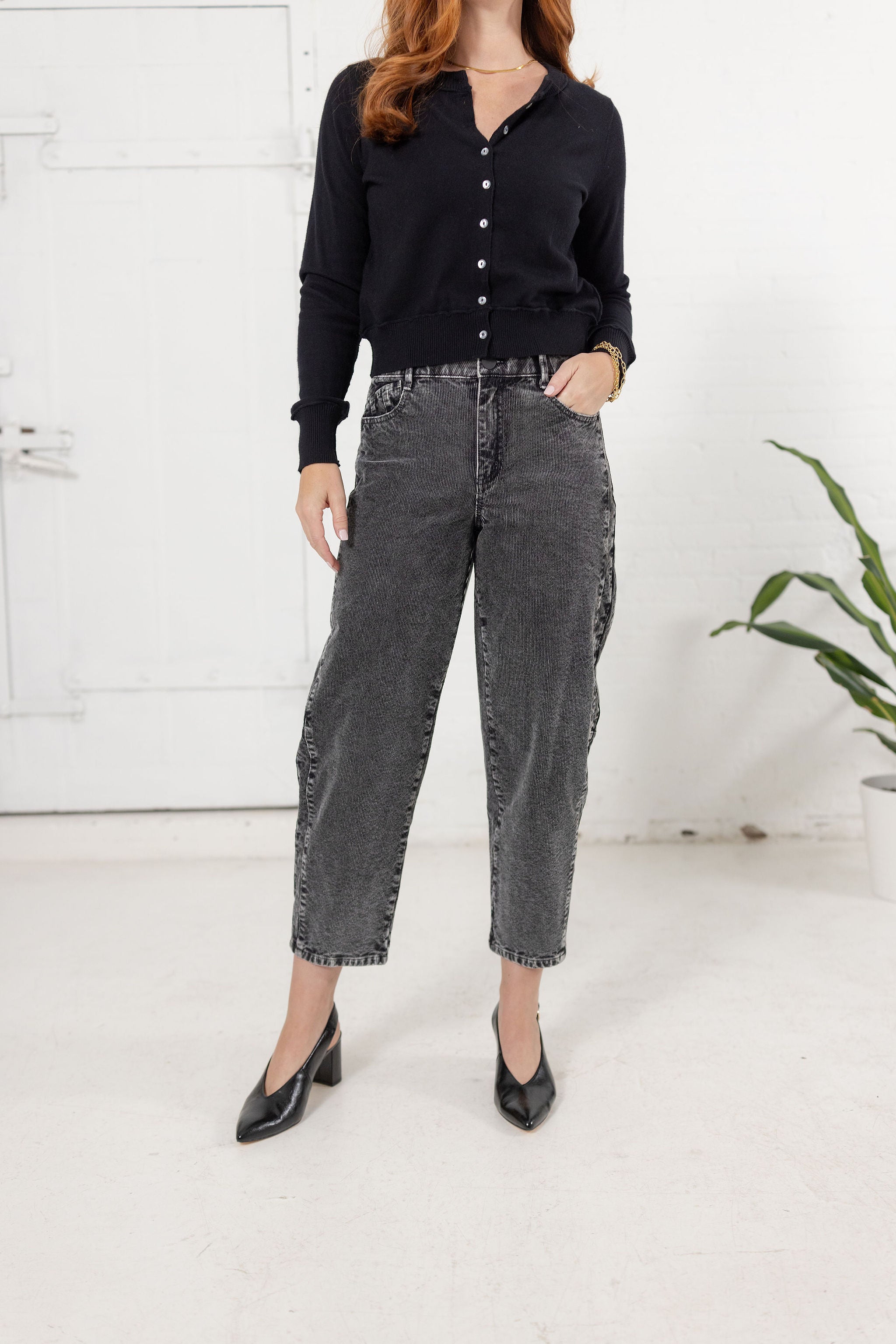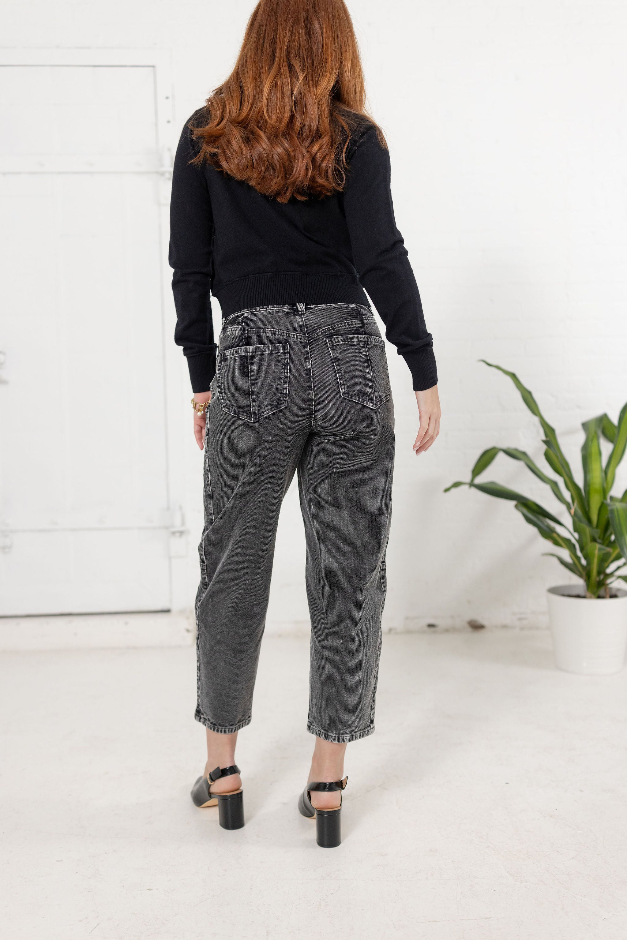 Meet your new statement denim. Designed in a soft washed charcoal finish, this elevated pant blends vintage inspiration with modern structure. Featuring a flattering high rise, unique barrel-shaped leg, and subtle corduroy texture, it delivers both comfort and cool-girl edge. Dress it up with a blouse and heels or go casual with a cozy knit and sneakers — the styling possibilities are endless.