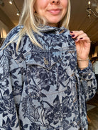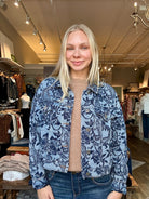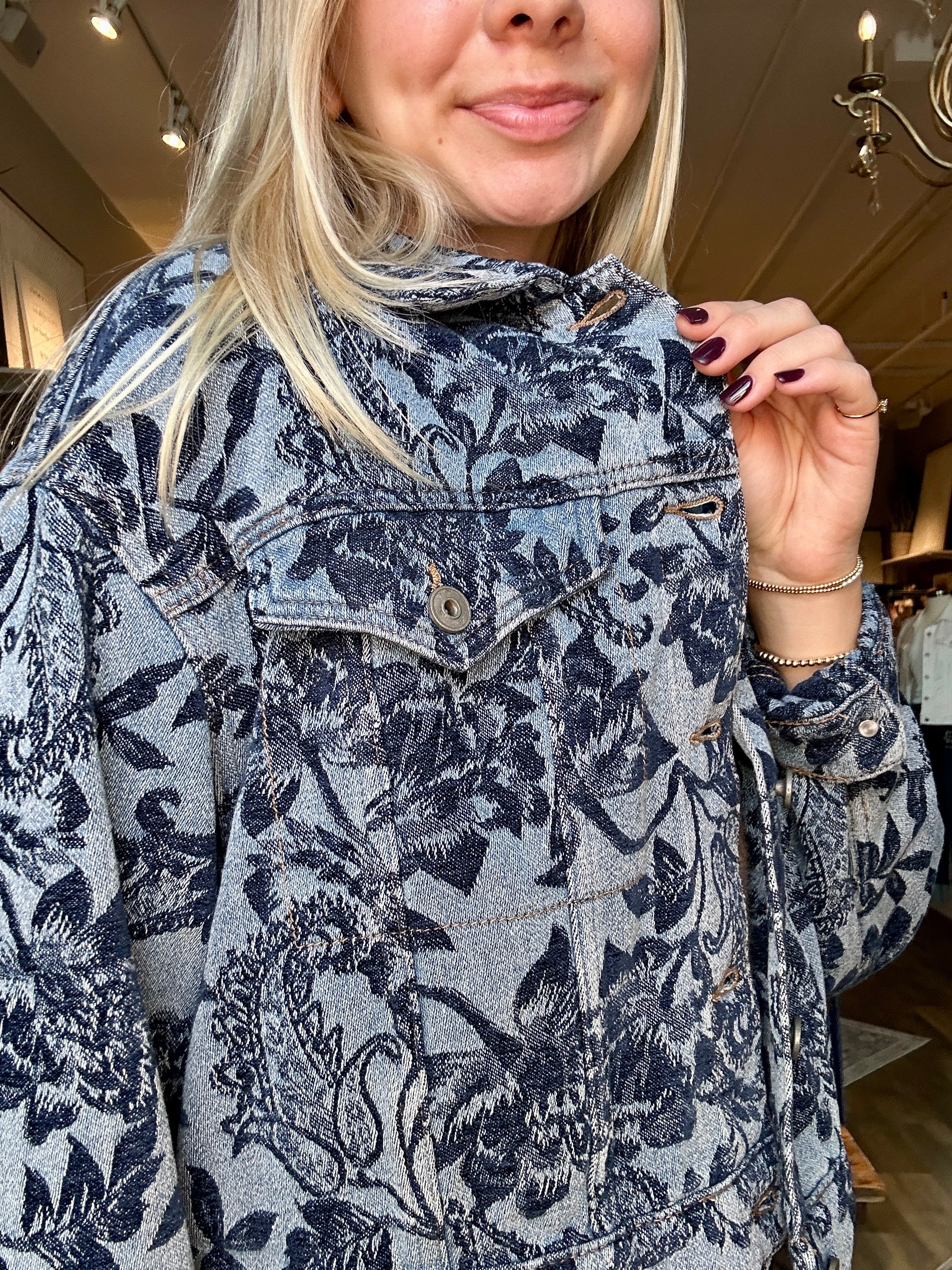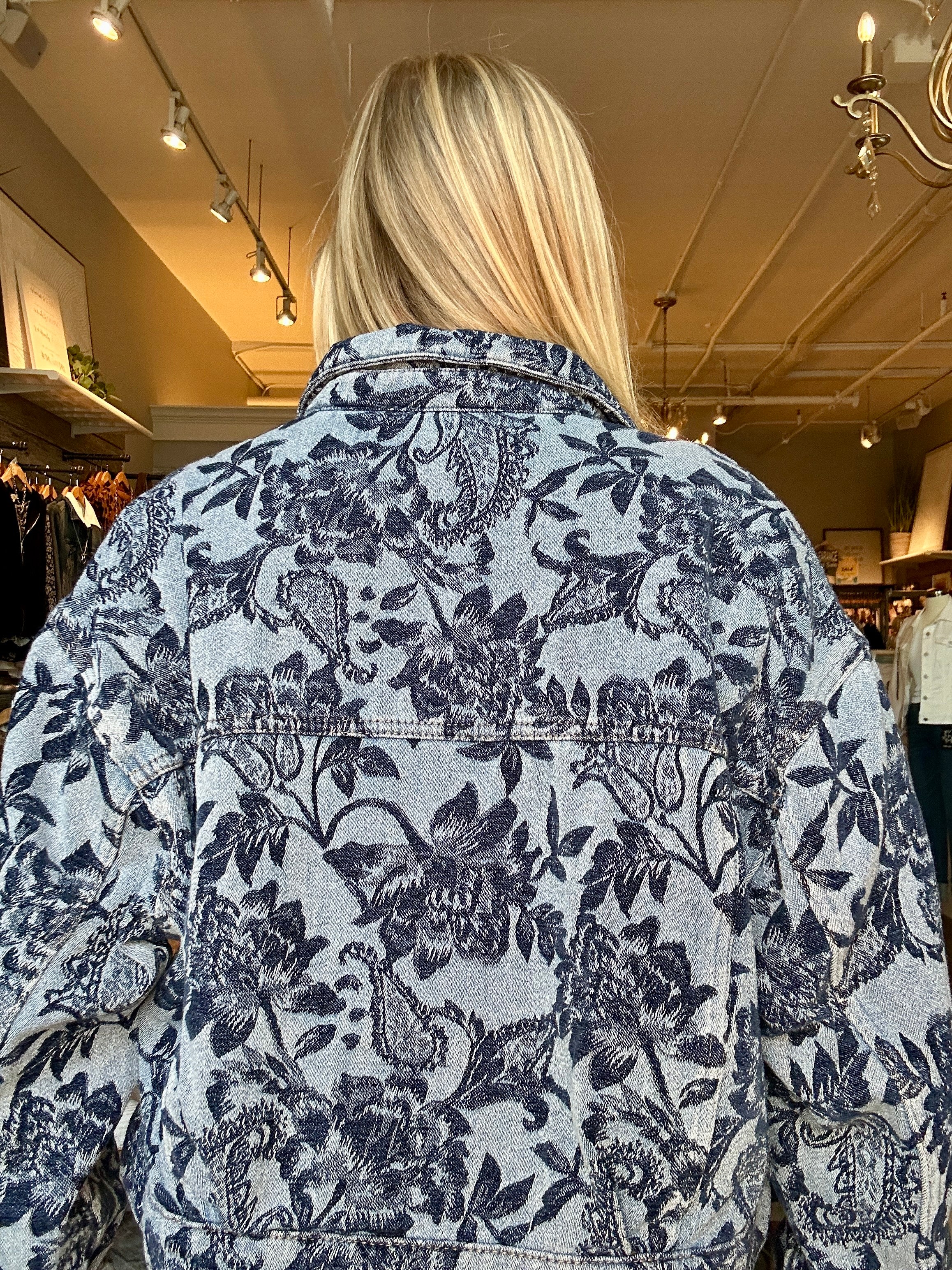 This unique denim jacket is just the piece you need to spice up your closet this fall. Crafted from a soft, light blue denim, this jacket features a distinctive all-over print in a darker shade of blue, combining delicate florals with classic paisley motifs. The timeless design includes a button-up front, a traditional collar, and functional chest pockets. Perfect for layering over your favorite tops and dresses.