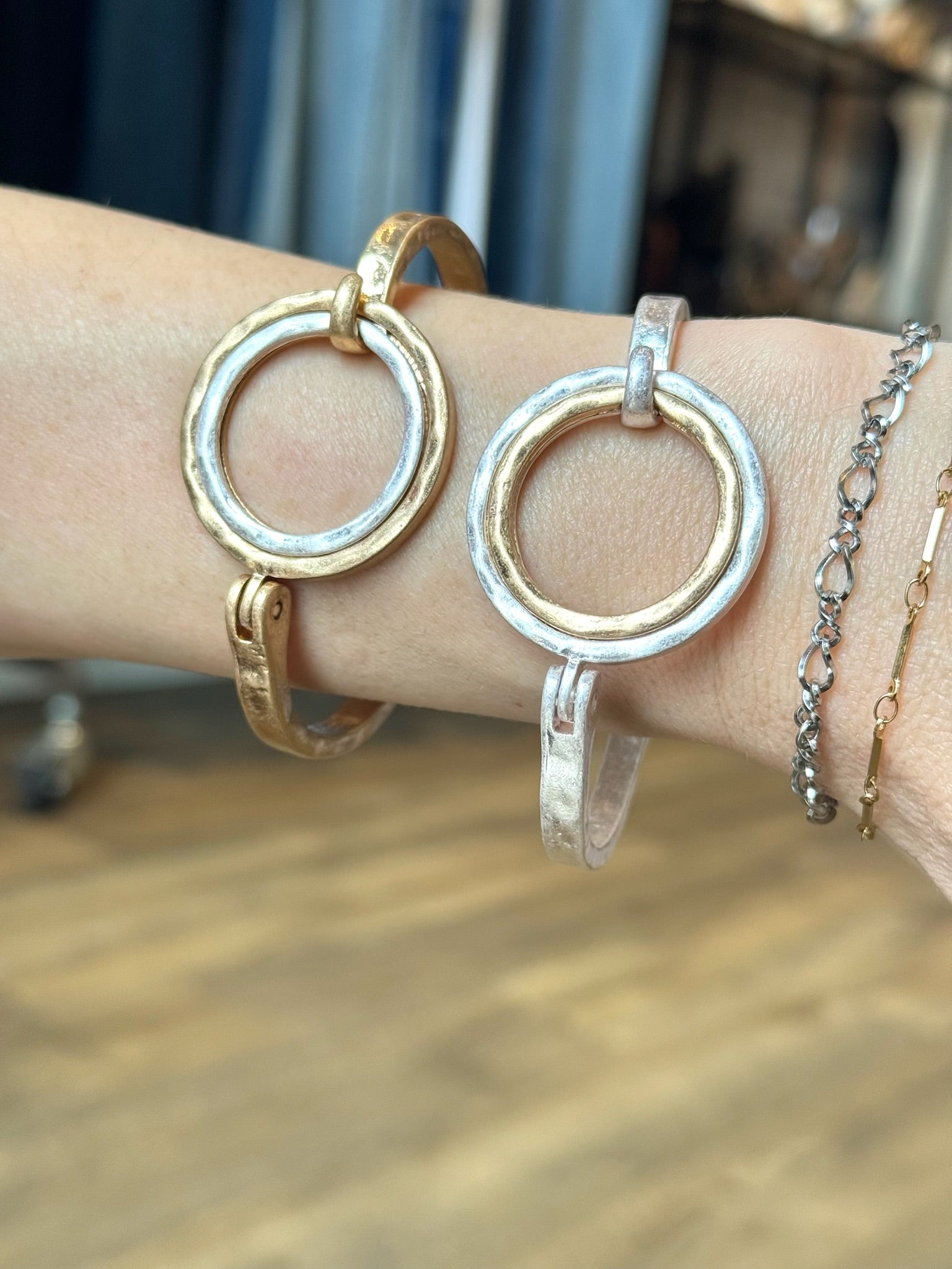 Two-Tone Metal Hammered Circle Bracelet