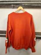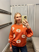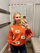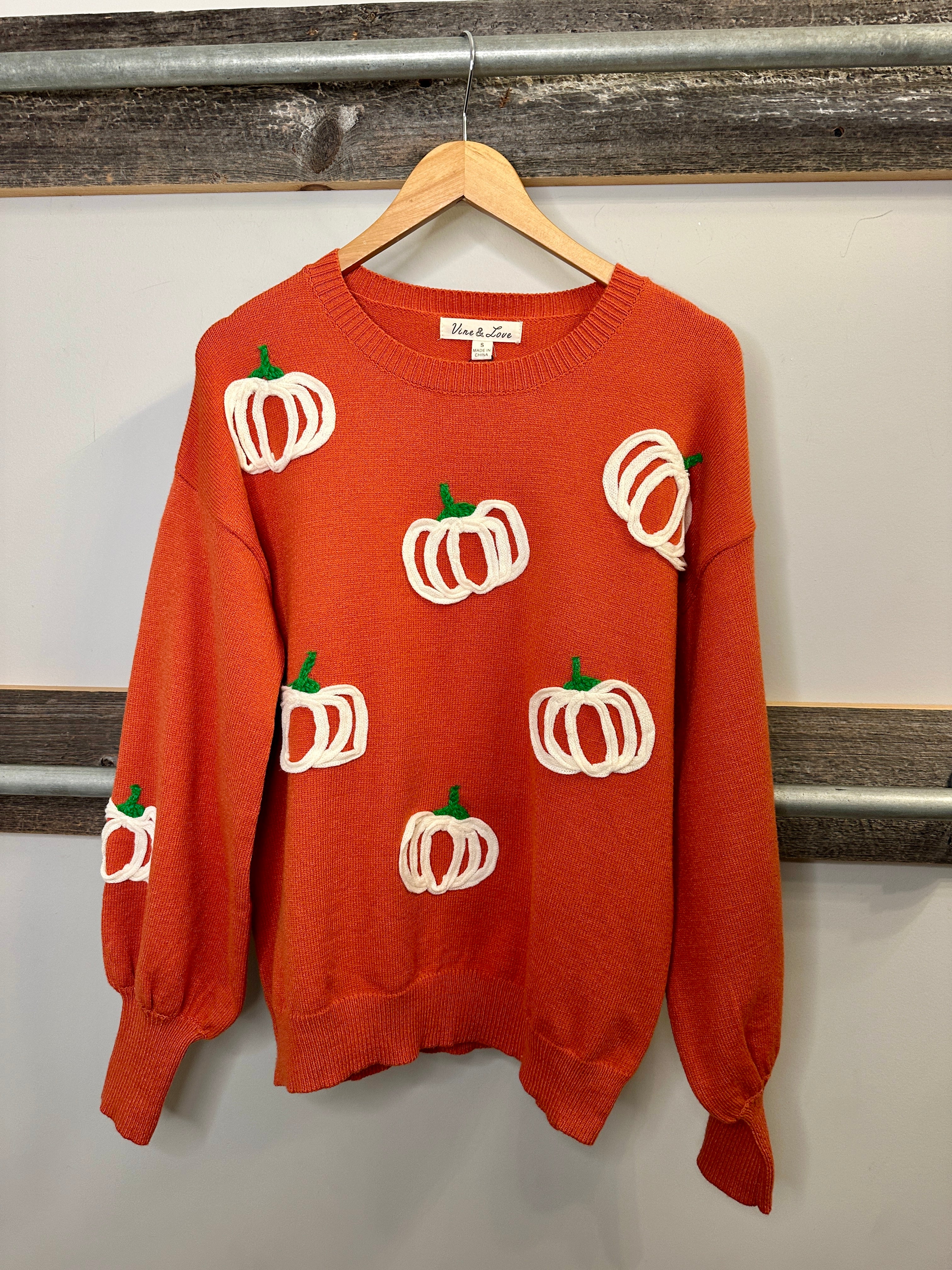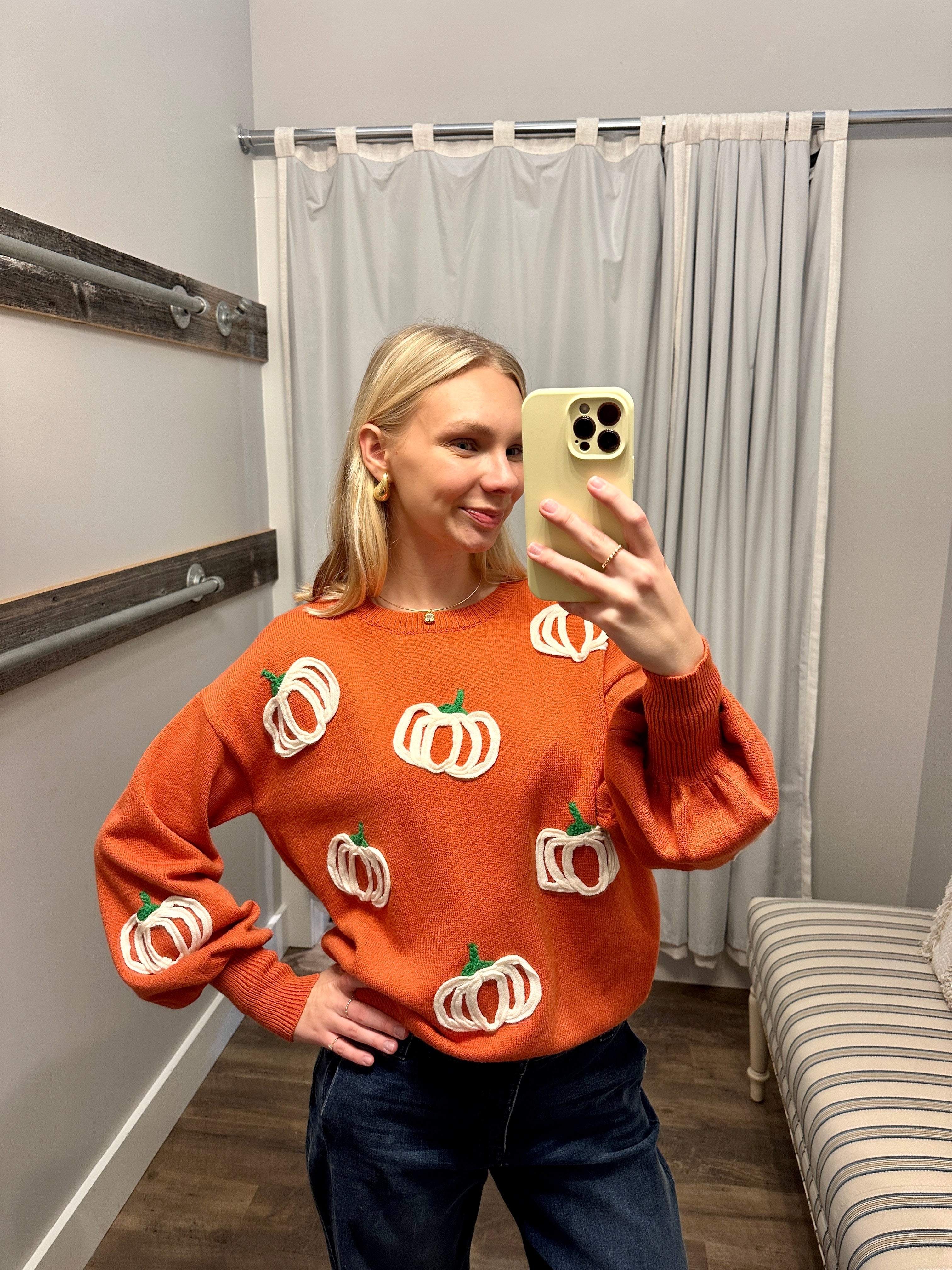This sweater is a cozy, festive knit pullover in a warm pumpkin-orange color, perfect for fall. It features playful 3D white pumpkin appliqués with green stems embroidered across the front and sleeves, adding a fun, seasonal charm. The design includes a classic crew neckline, relaxed fit, and slightly ballooned sleeves that taper into ribbed cuffs for a comfortable, flattering shape.