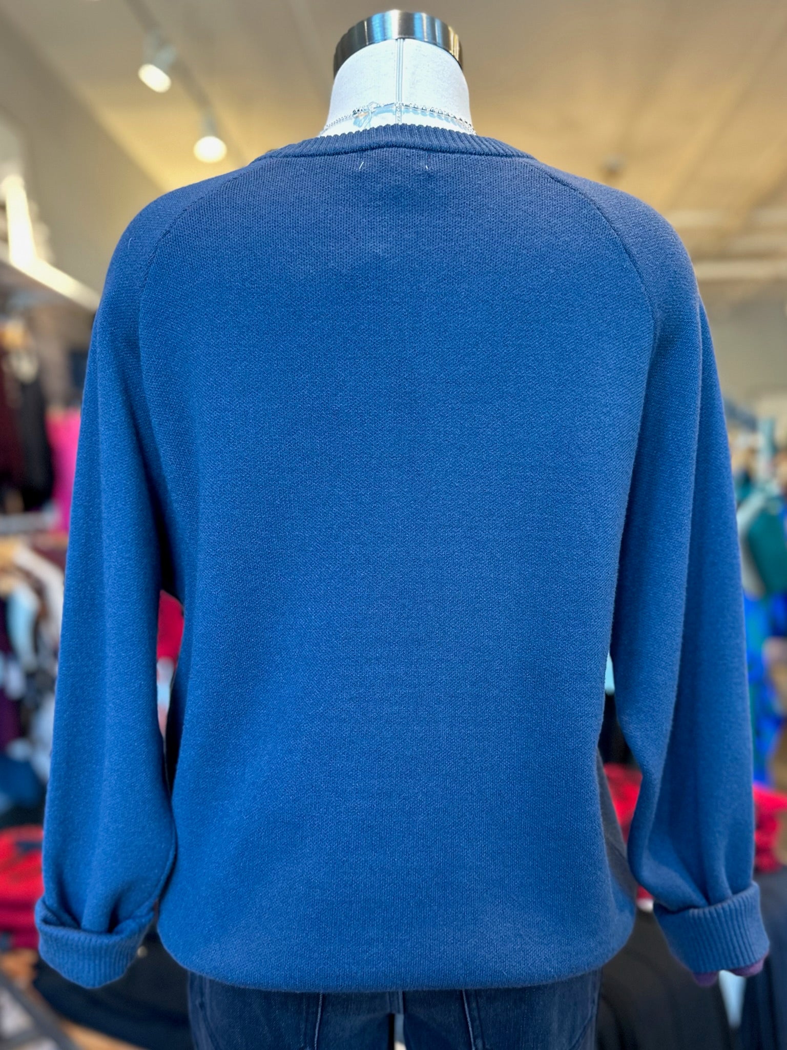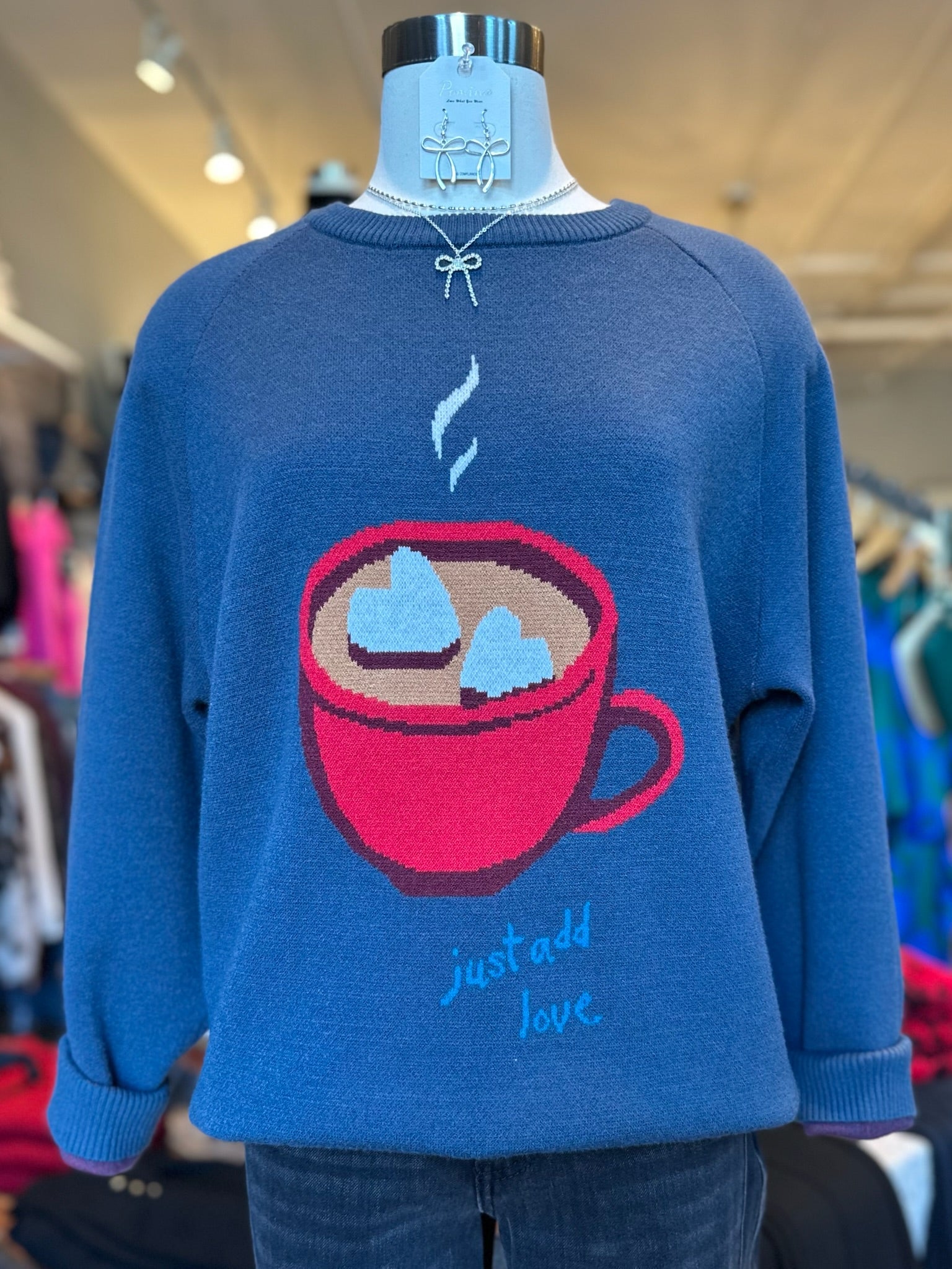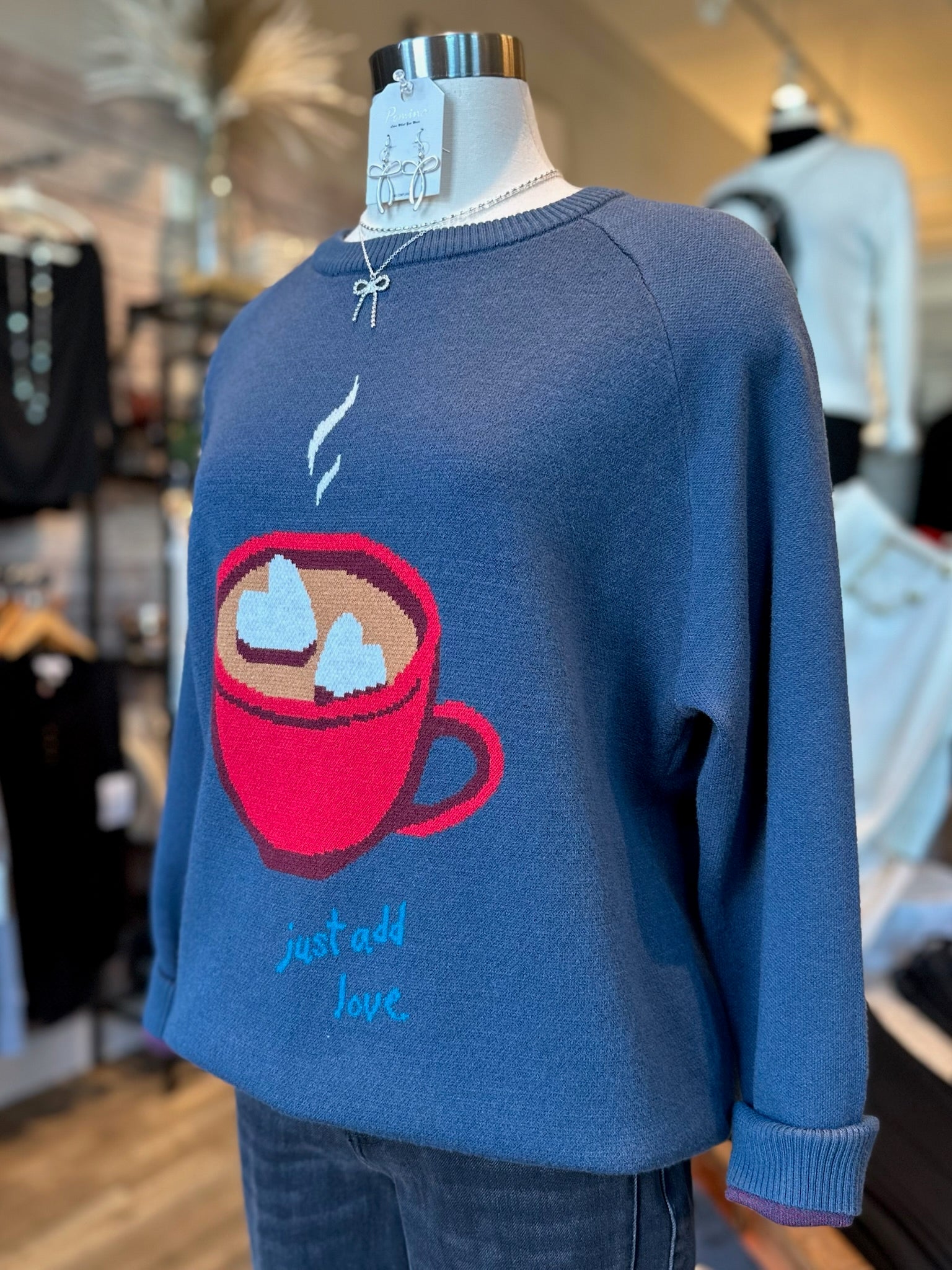 This cozy hot cocoa sweater top brings warmth and charm together in the most effortless way. Featuring a rich blue knit base with a playful cocoa mug graphic and heart-shaped marshmallows, it adds a touch of whimsy while still feeling elevated and wearable. The relaxed silhouette drapes softly over the body, making it flattering without feeling oversized, while the classic crew neckline frames the collarbone beautifully and allows for easy layering with necklaces.