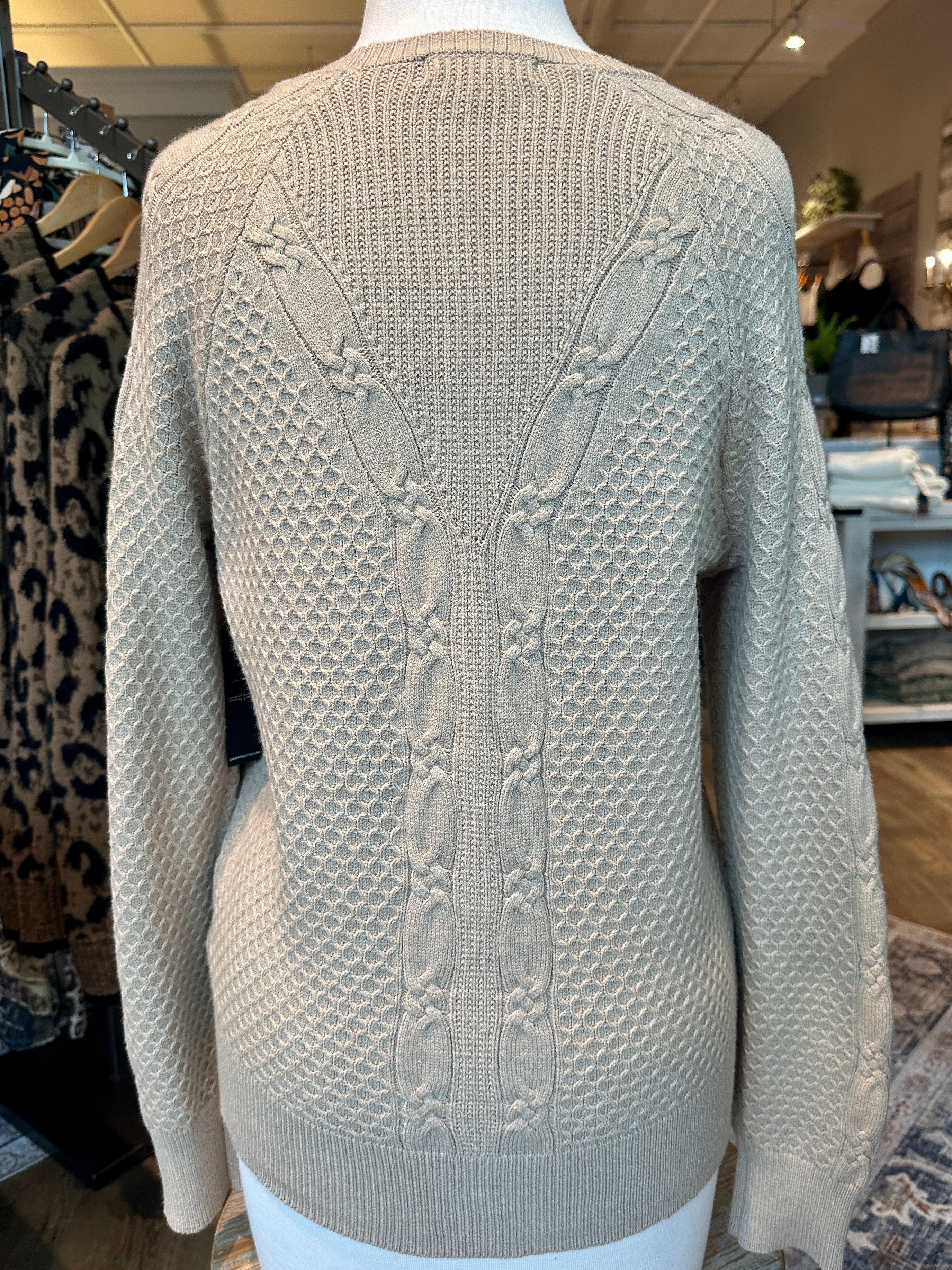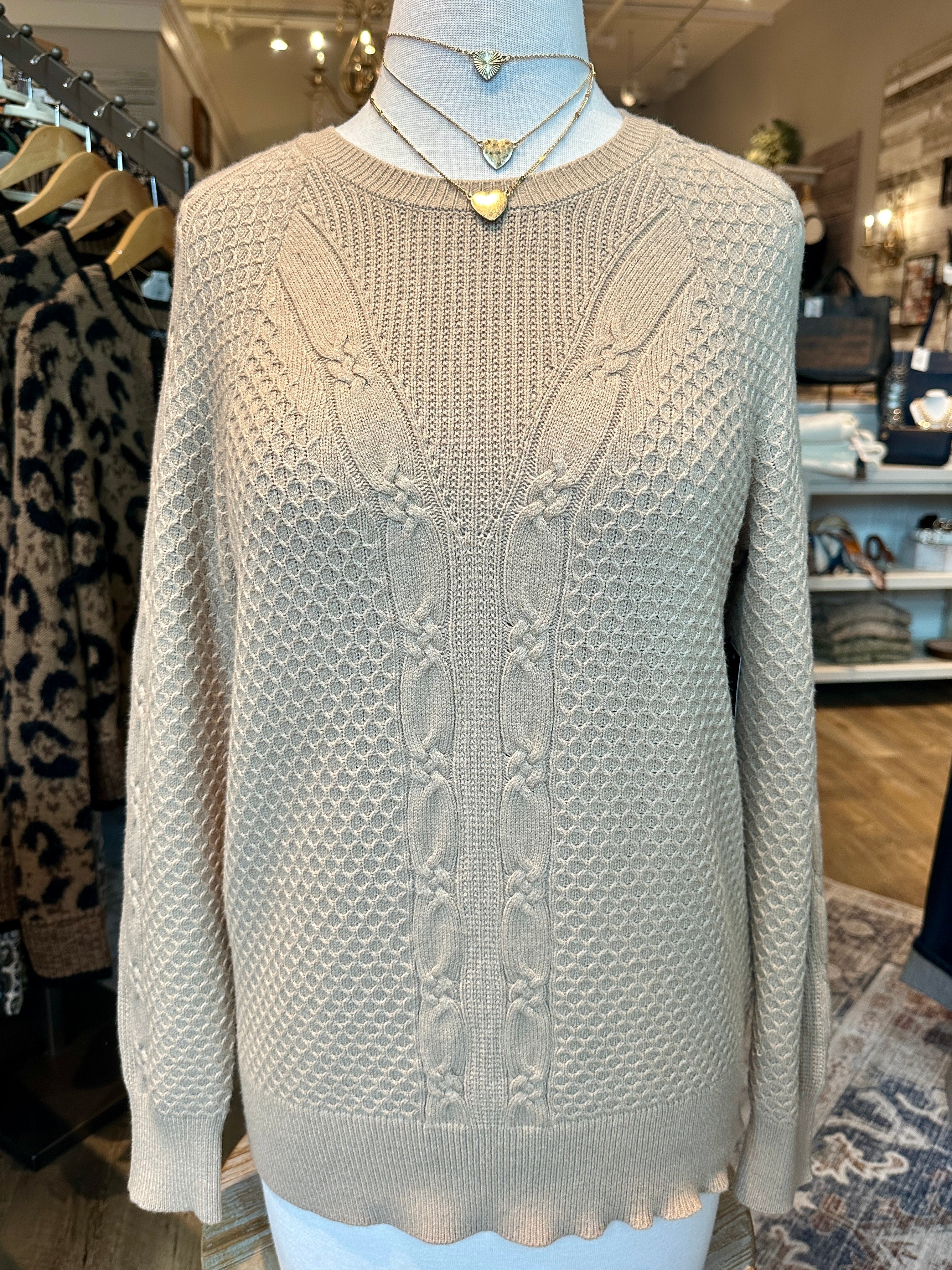 This beautifully detailed sweater features a mix of cable and honeycomb knit patterns that create dimension and sophistication from every angle. The soft neutral tone pairs effortlessly with denim, trousers, or skirts, making it a timeless addition to your wardrobe. Designed with ribbed cuffs and hem for a flattering fit, this piece delivers both warmth and elegance — perfect for cozy fall days, office wear, or casual outings.