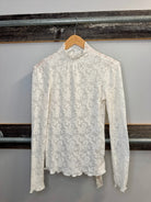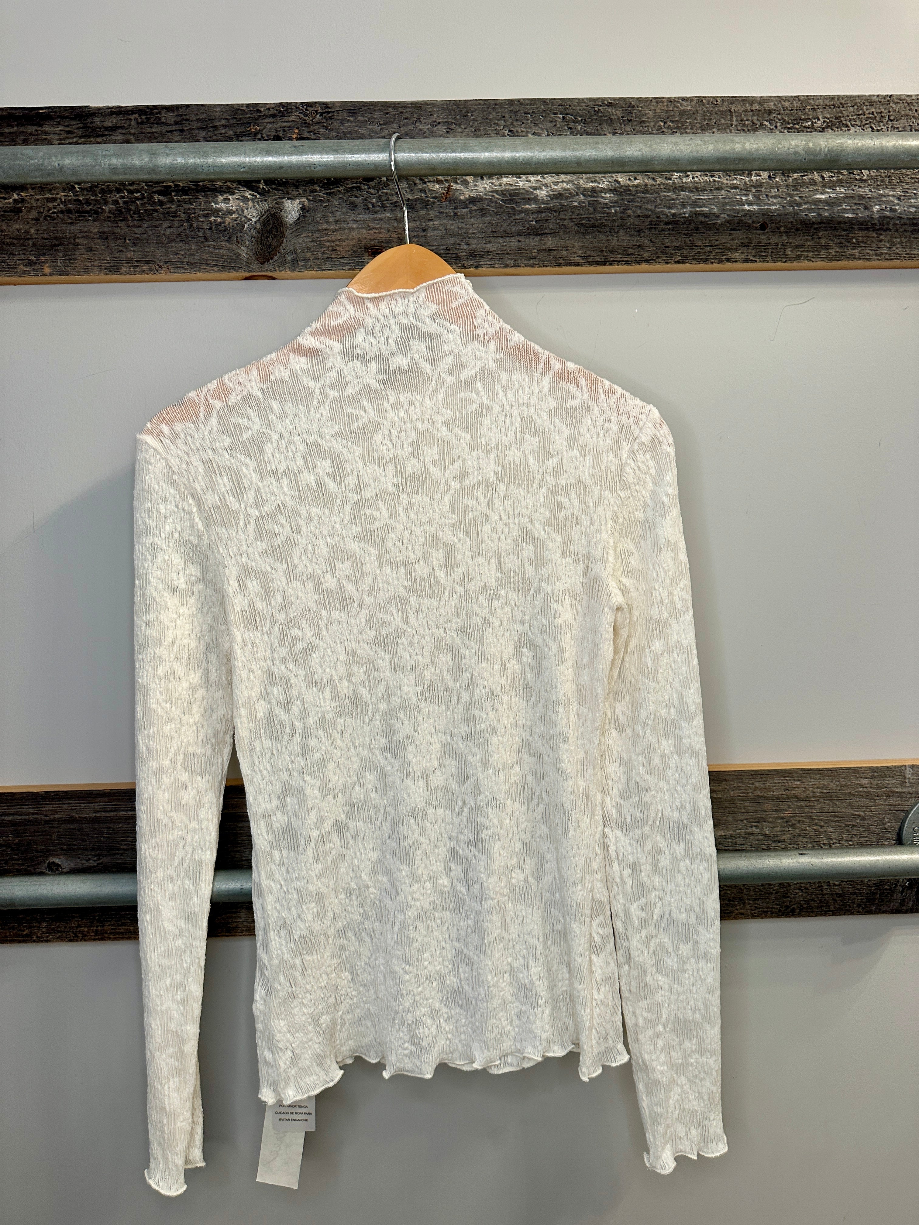 This fitted knit top features long sleeves, a cinched mock neckline, and a distinctive lettuce edge texture for a refined, stylish look.