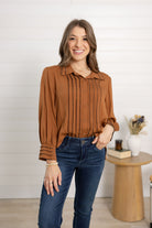 This woven button down shirt is all about the texture. It’s designed with a classic three quarter-length sleeve, collar neck, and a slit shirttail hem, but its scallop edge tipping detail is what takes this style up a notch.
