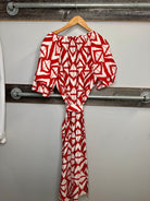 This stunning red and white dress, complete with a chic straw belt buckle, is the perfect blend of playful and elegant. Featuring charming ruffled sleeves and a flattering midi length, it’s a versatile piece you can style effortlessly for any occasion.