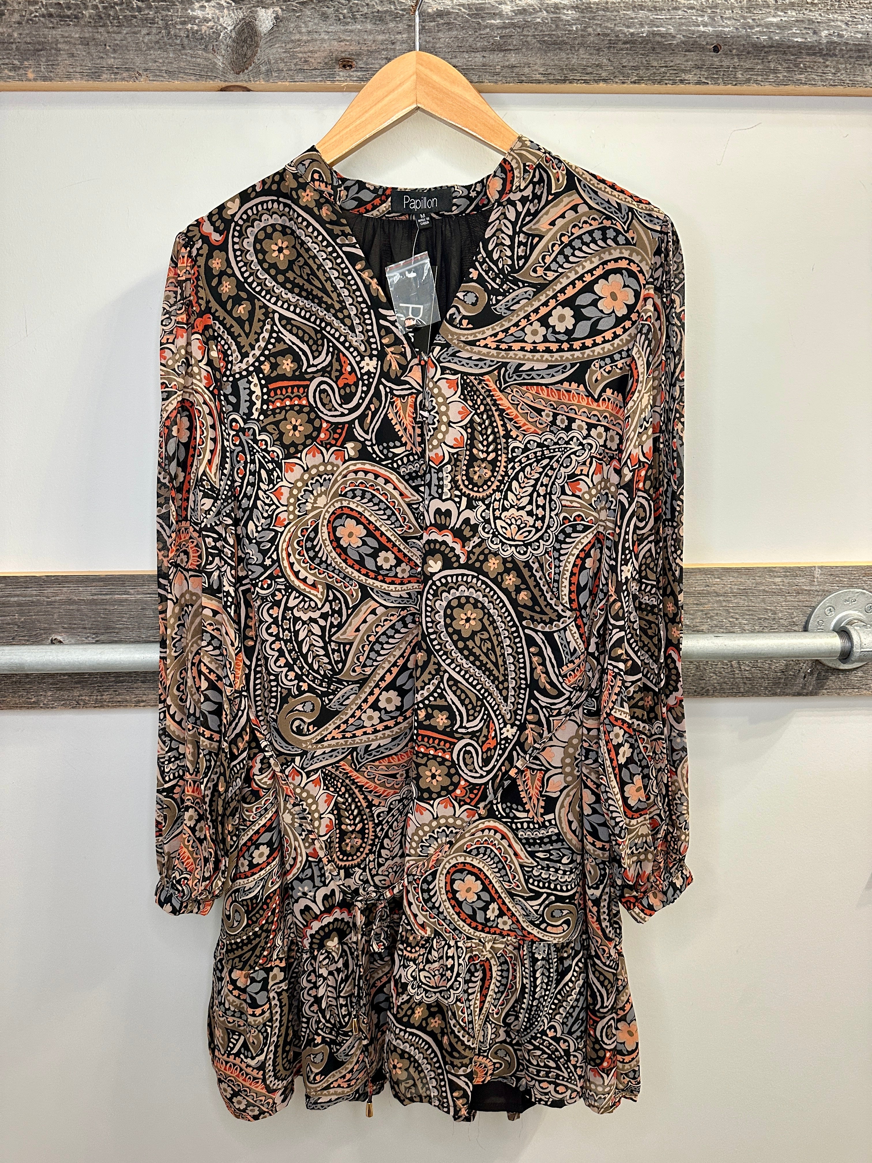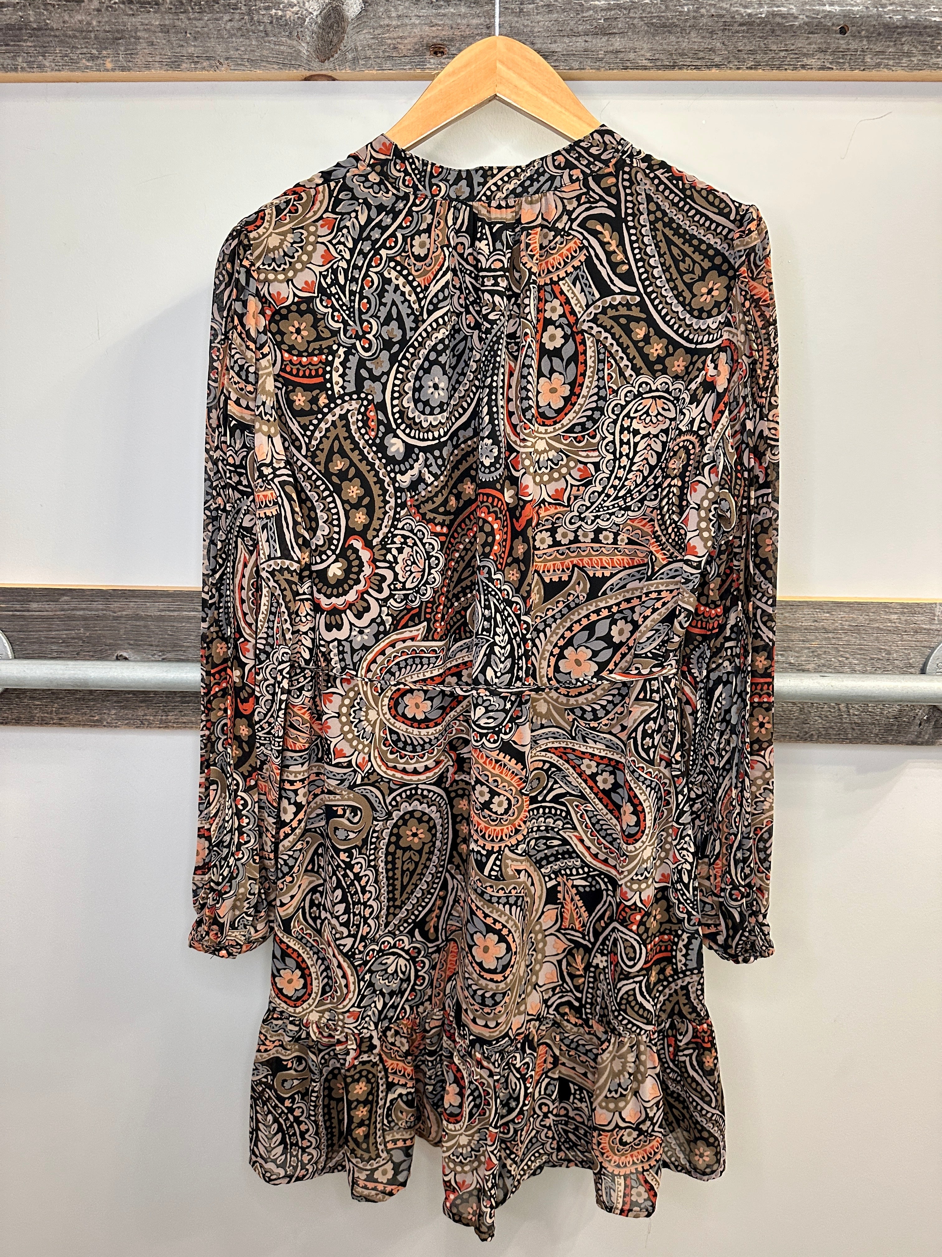 Paisley Long Sleeve Dress with Ruffle Hem and Tie Belt